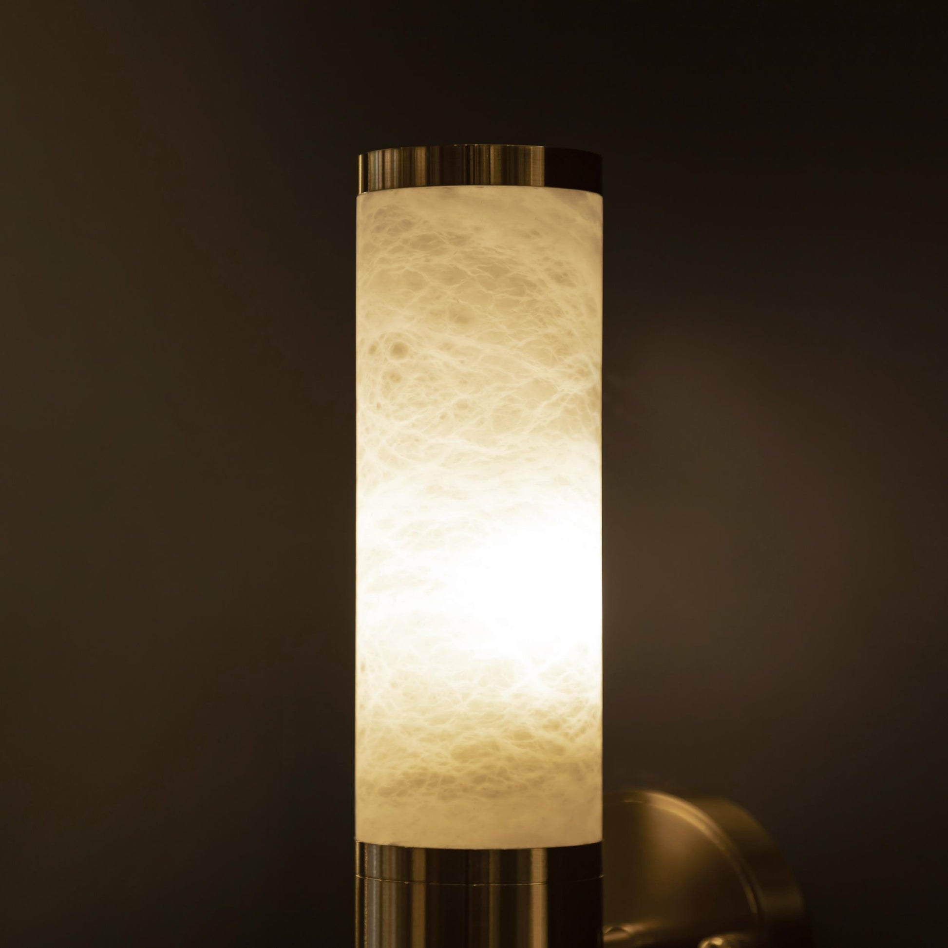Arkas Aplik, doğal mermerin zarif dokusu ve eskitme metal detaylarıyla mekâna sofistike bir hava katar. Silindirik formuyla modern ve klasik dekorasyonlarda kolayca uyum sağlar. Sıcak ışık yansıması sayesinde hem dekoratif hem de fonksiyonel bir aydınlatma sunar.