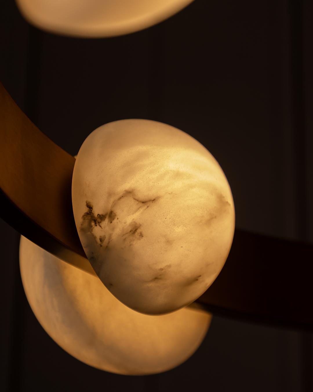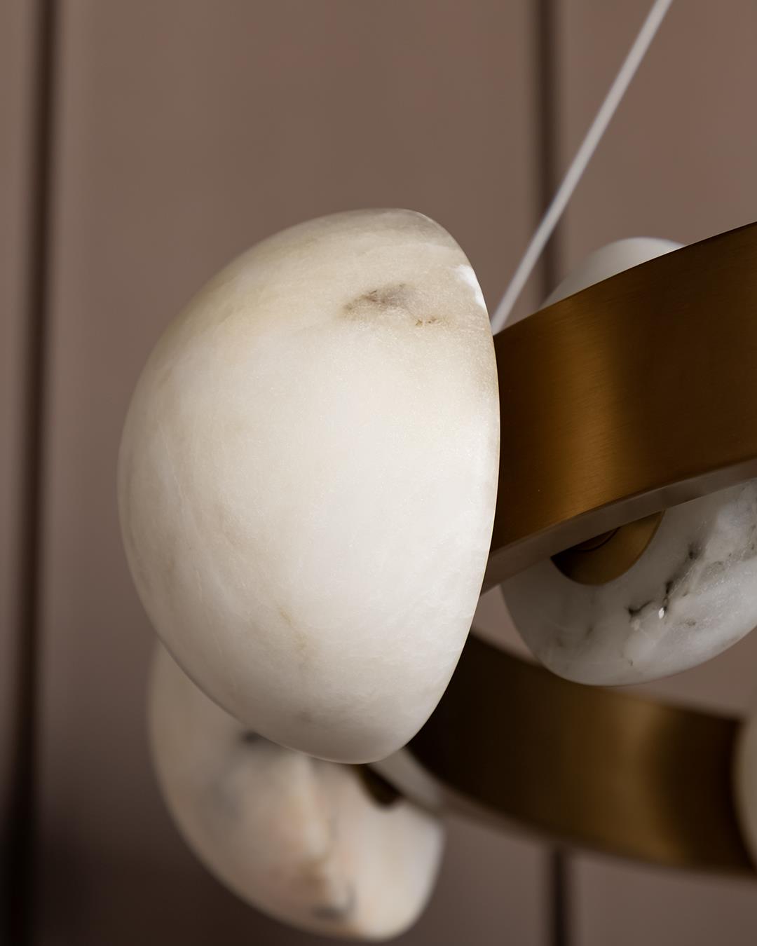 Hartum Avize, eskitme metal gövdesiyle birleşen doğal beyaz mermer detayları sayesinde zamansız ve sofistike bir tasarım sunar. Mermerin özgün damarları, her bir ürüne tekil bir karakter kazandırırken; yatay yerleşimiyle geniş salonlarda dengeli bir aydınlık sağlar. Modern çizgilerle klasik dokuları ustalıkla buluşturan bir formdadır.