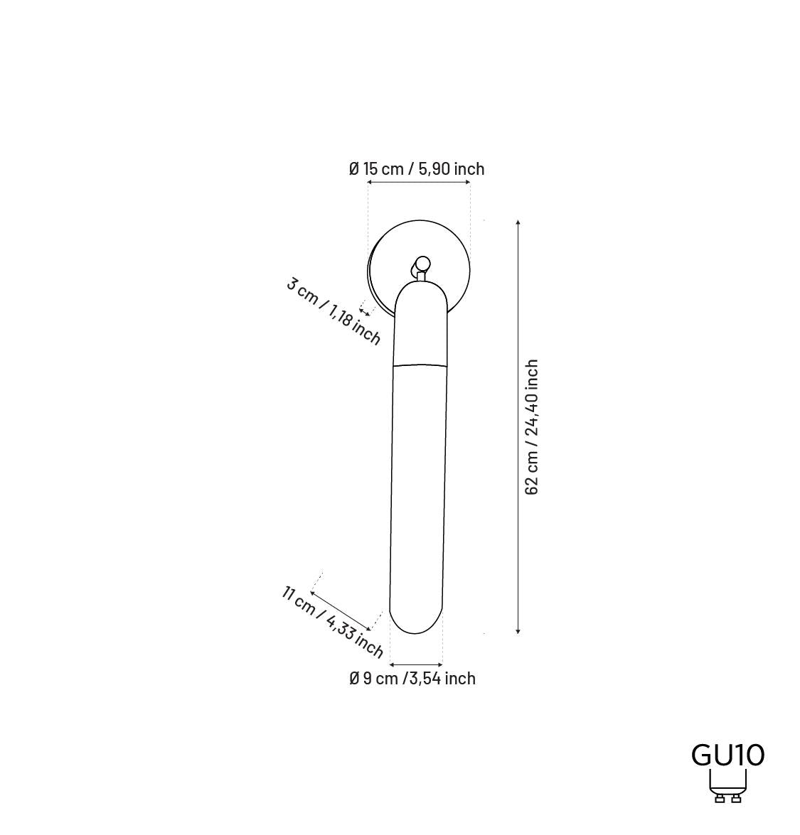 GU10 ampul desteği sayesinde net ve odaklı bir aydınlatma sunar. Uzun formu, özellikle dar duvar yüzeylerinde çizgisel bir bütünlük sağlar. Gold detaylar ise dekorasyona sıcaklık katar.