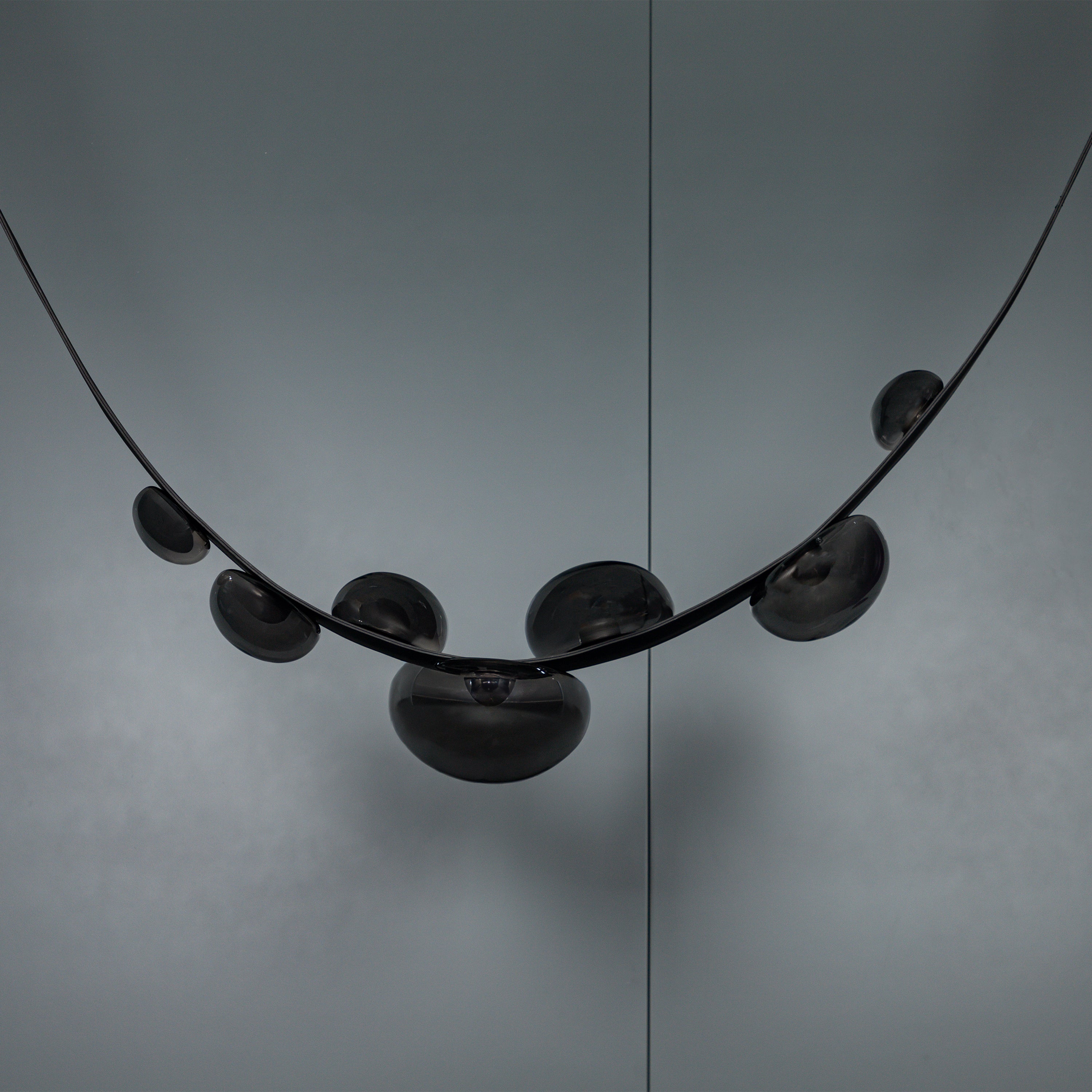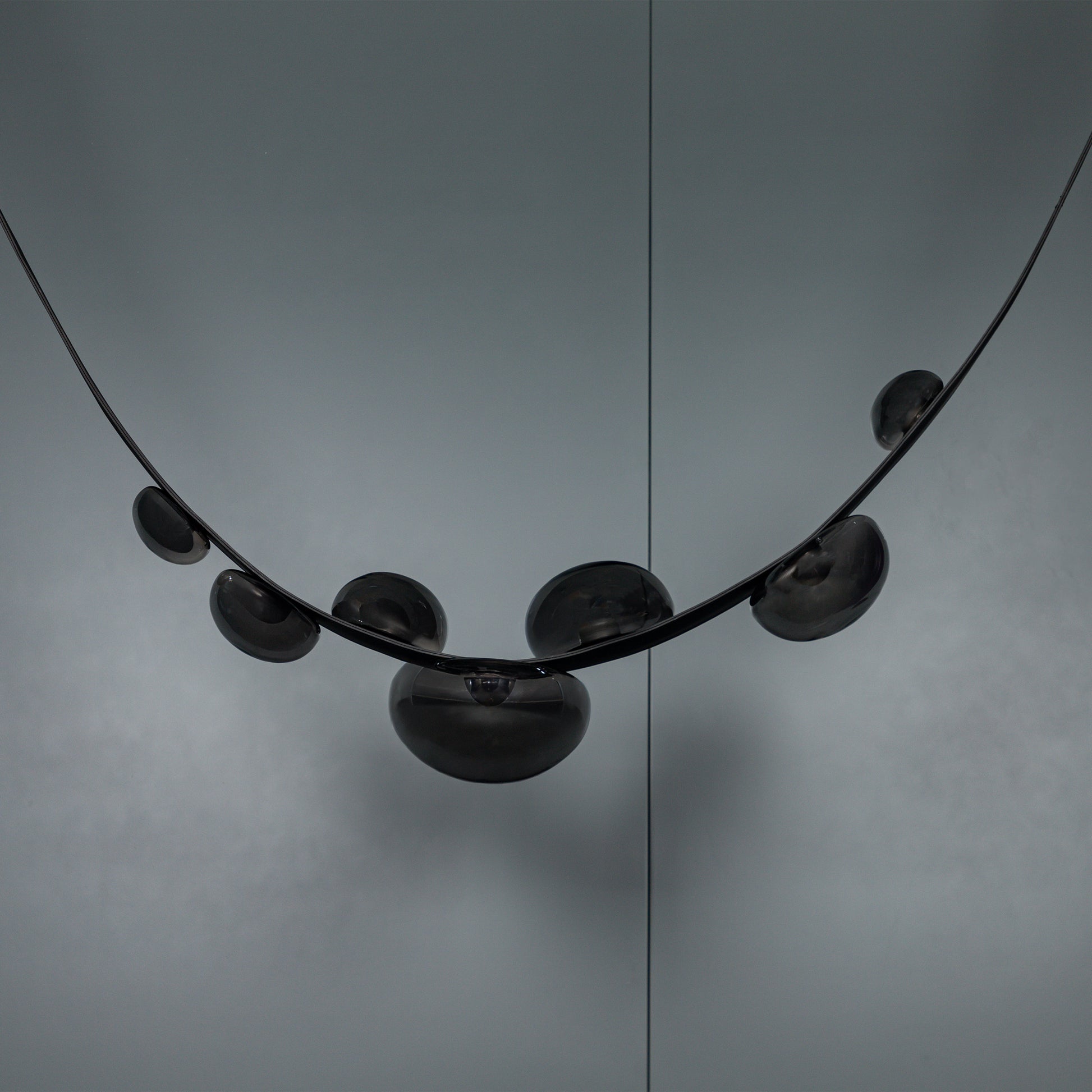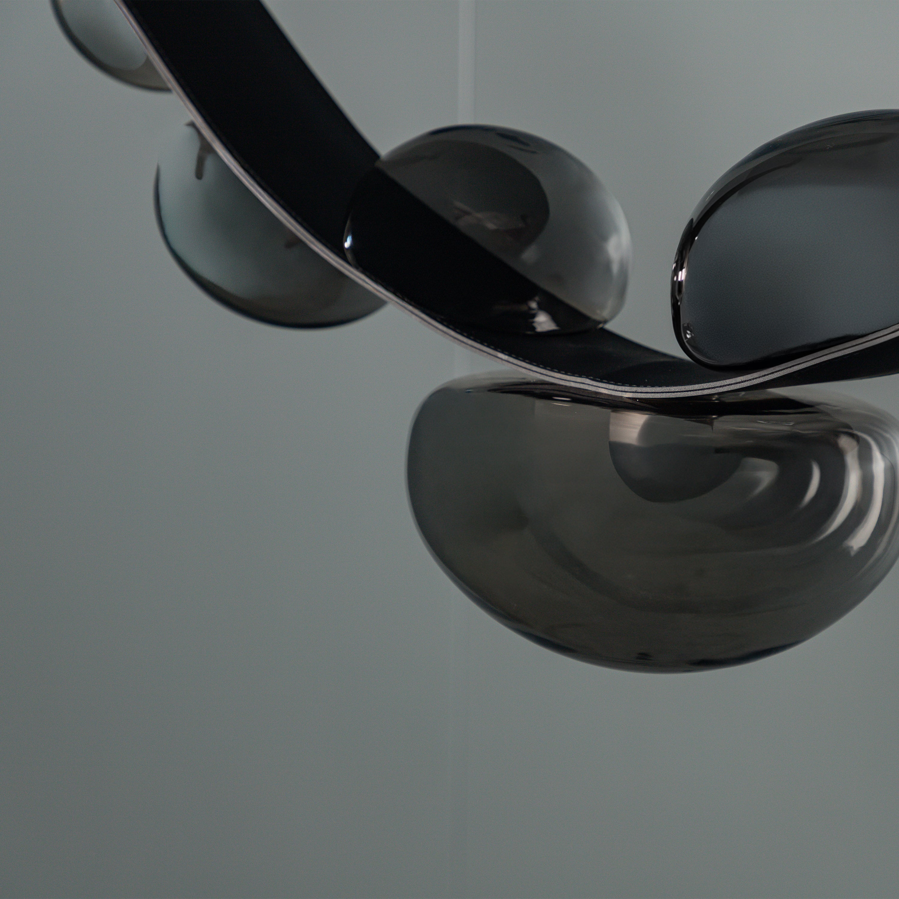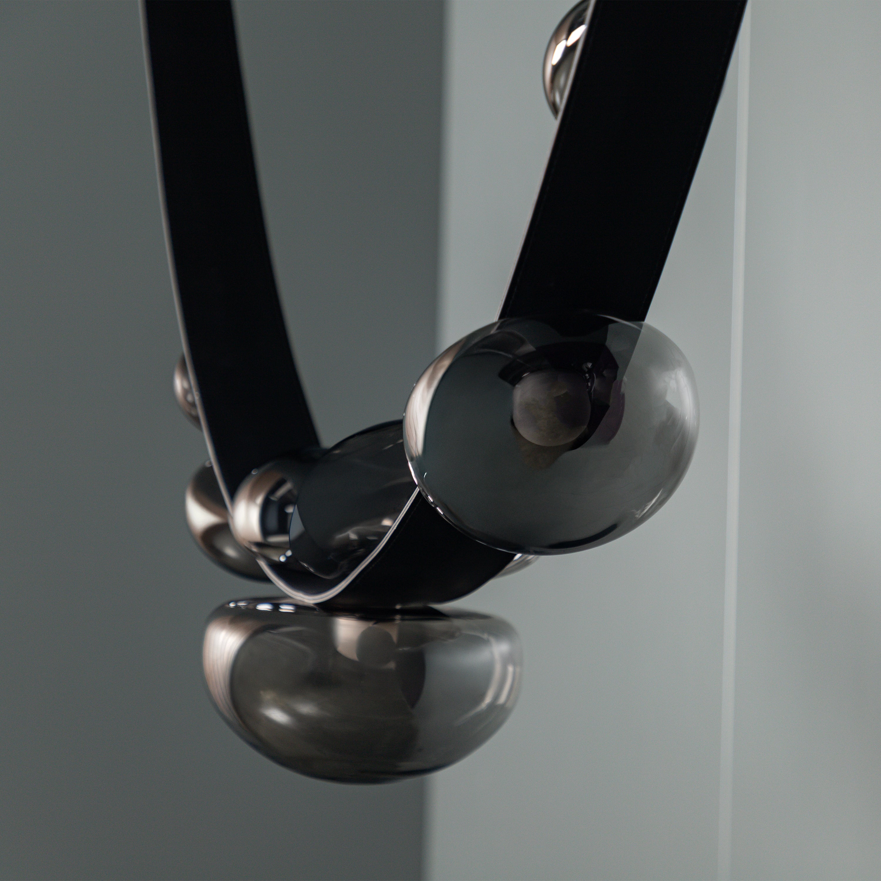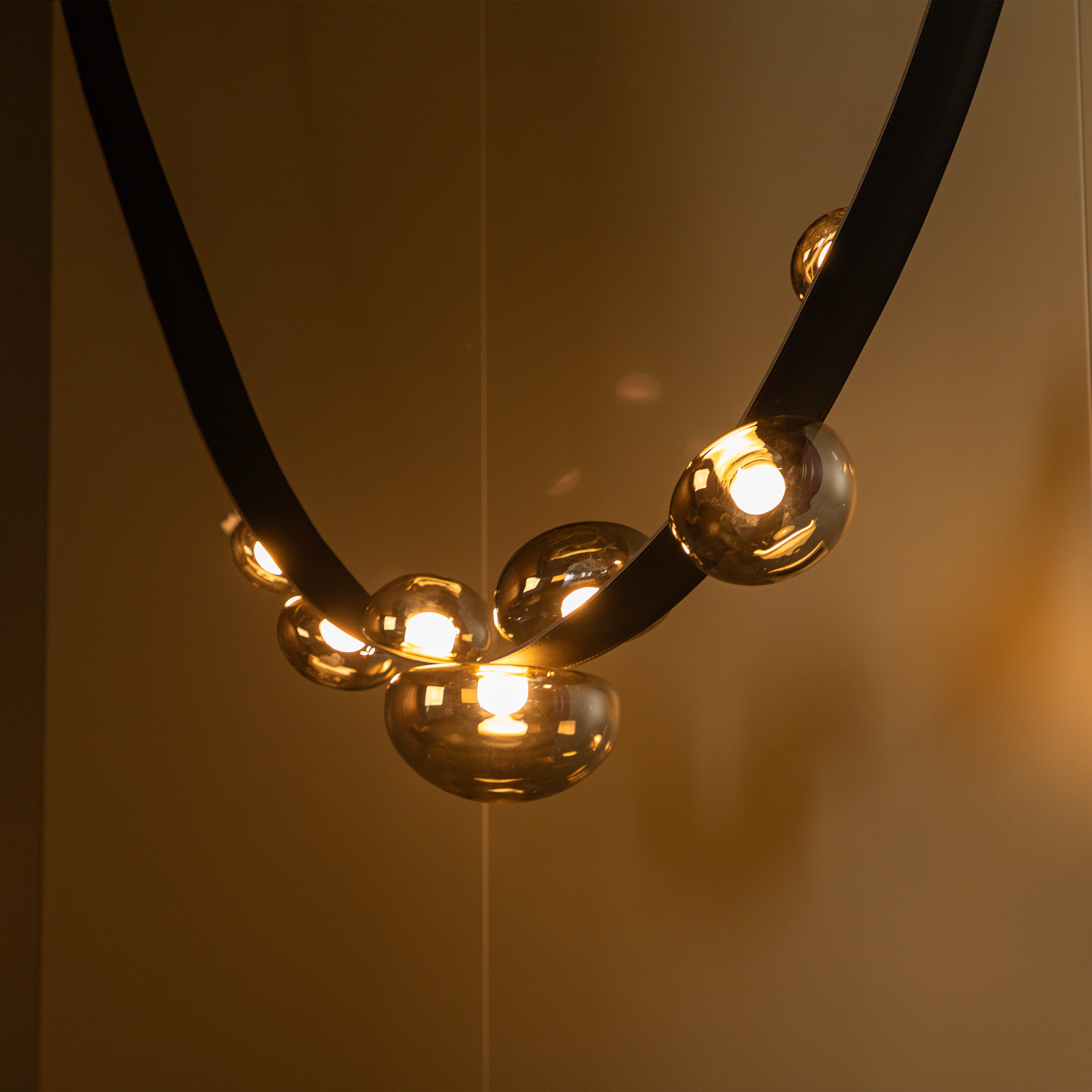Labranda Avize, füme cam kürelerin siyah deri kemerlerle birleştiği güçlü bir tasarım anlayışını yansıtır. Yedi başlı formu sayesinde mekâna hacim kazandırırken, füme camın loş ve sofistike yansımalarıyla dikkat çeker. Deri detaylar, klasik dokulara çağdaş bir yorum katarak avizeye özgün bir karakter kazandırır.