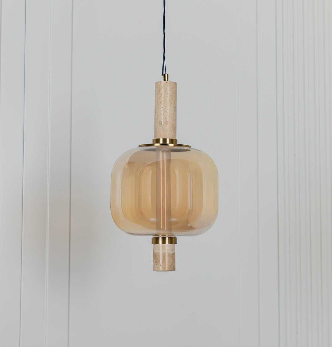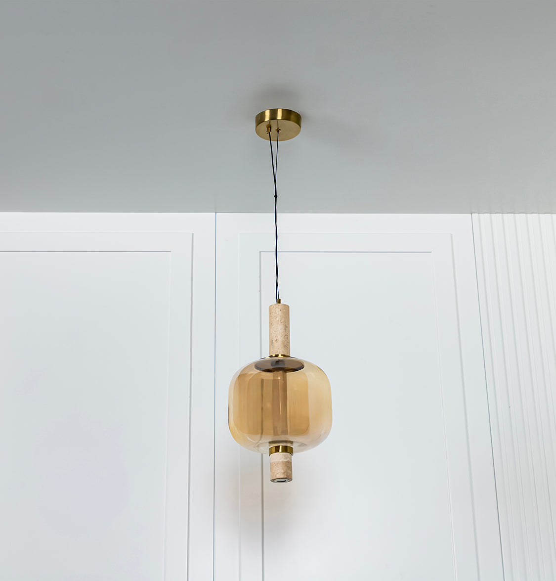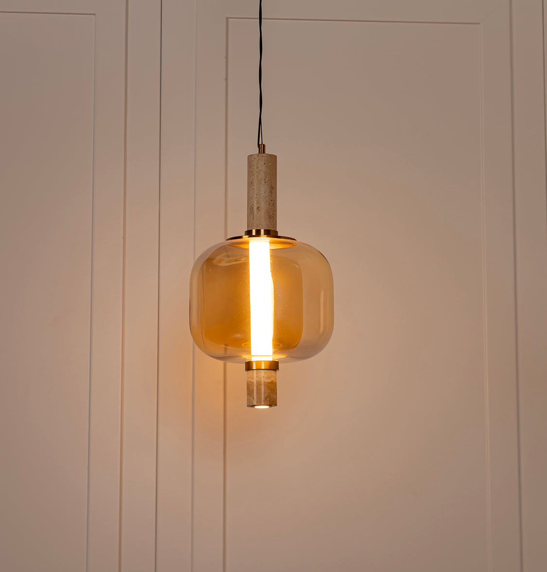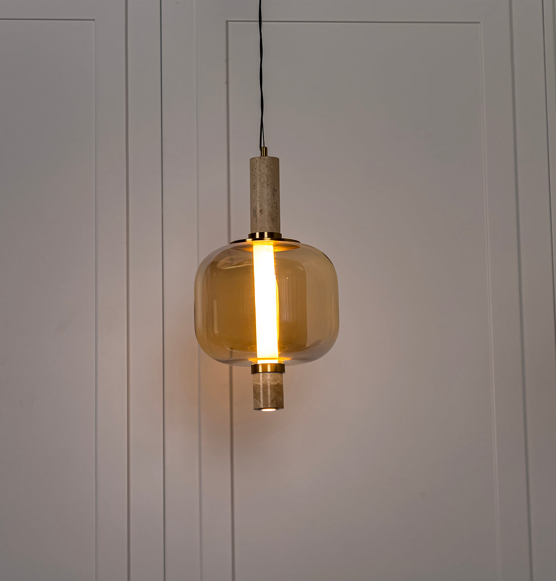 Siena Tekli Sarkıt, sıcak tonlu bal cam gövdesi ve doğal traverten taş detaylarıyla bulunduğu ortama yumuşak, davetkâr bir atmosfer kazandırır. Modern formlu bu tasarım, gün ışığı LED aydınlatmasıyla birleştiğinde iç mekânda hem fonksiyonel hem dekoratif bir vurguya dönüşür.