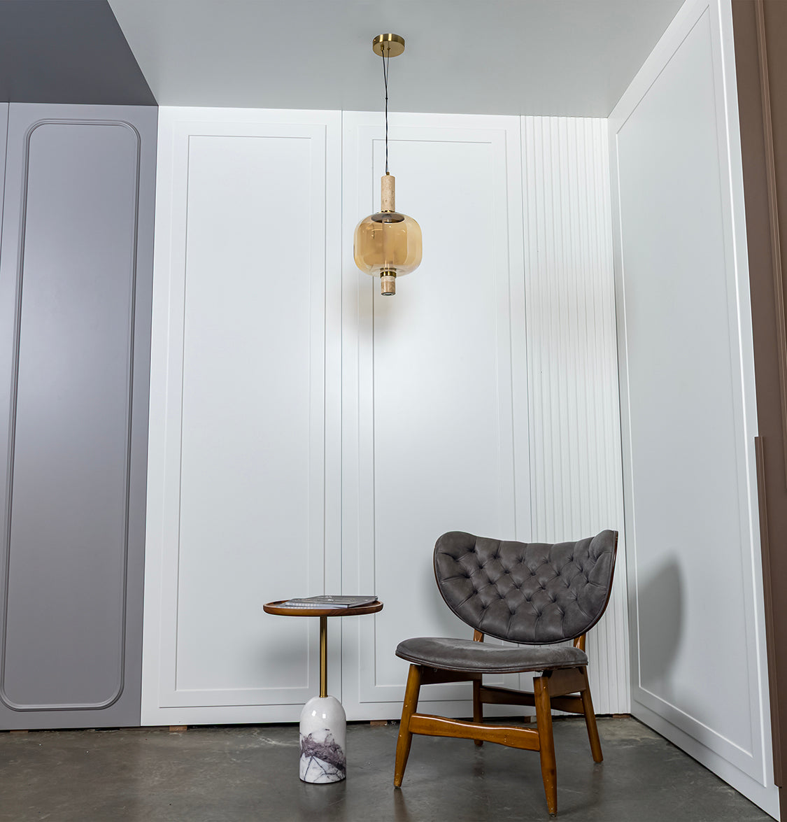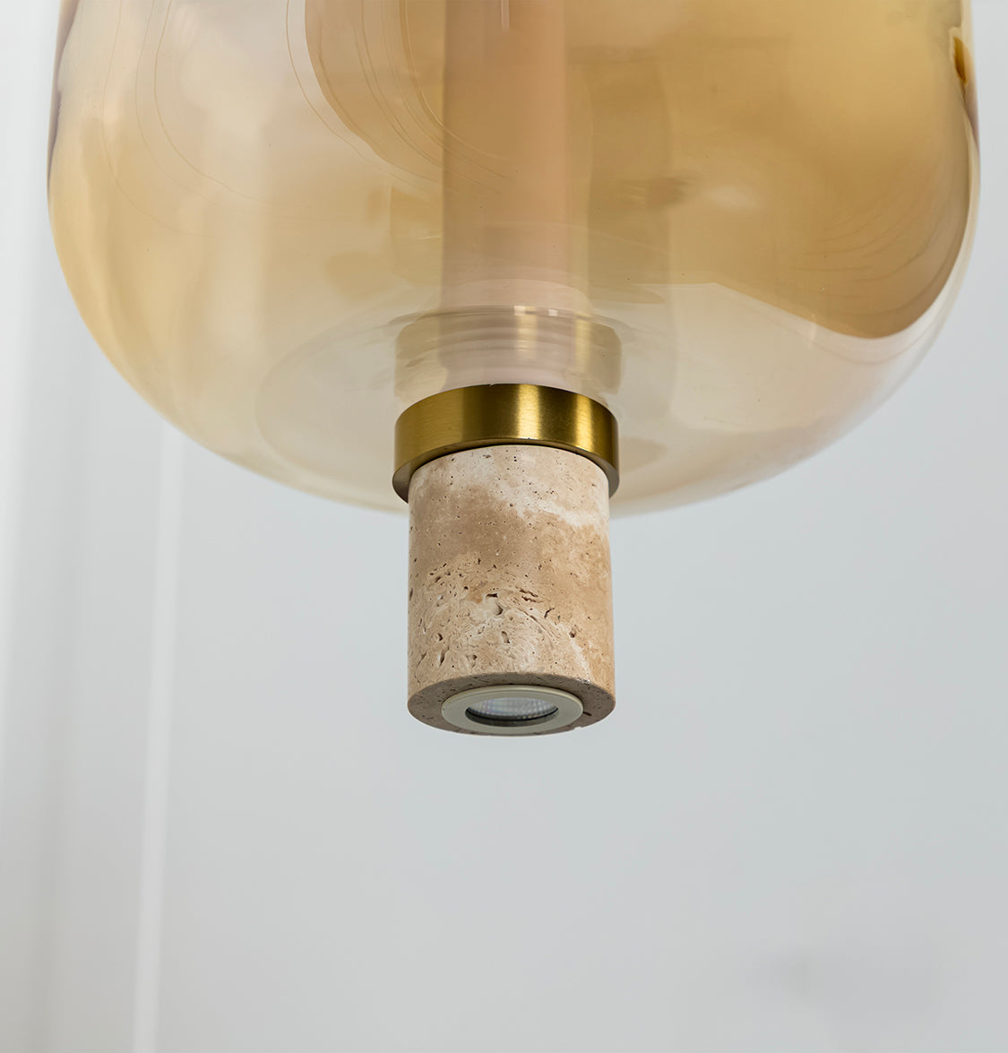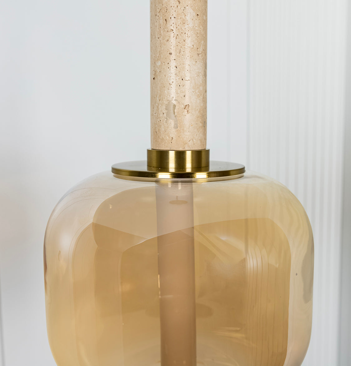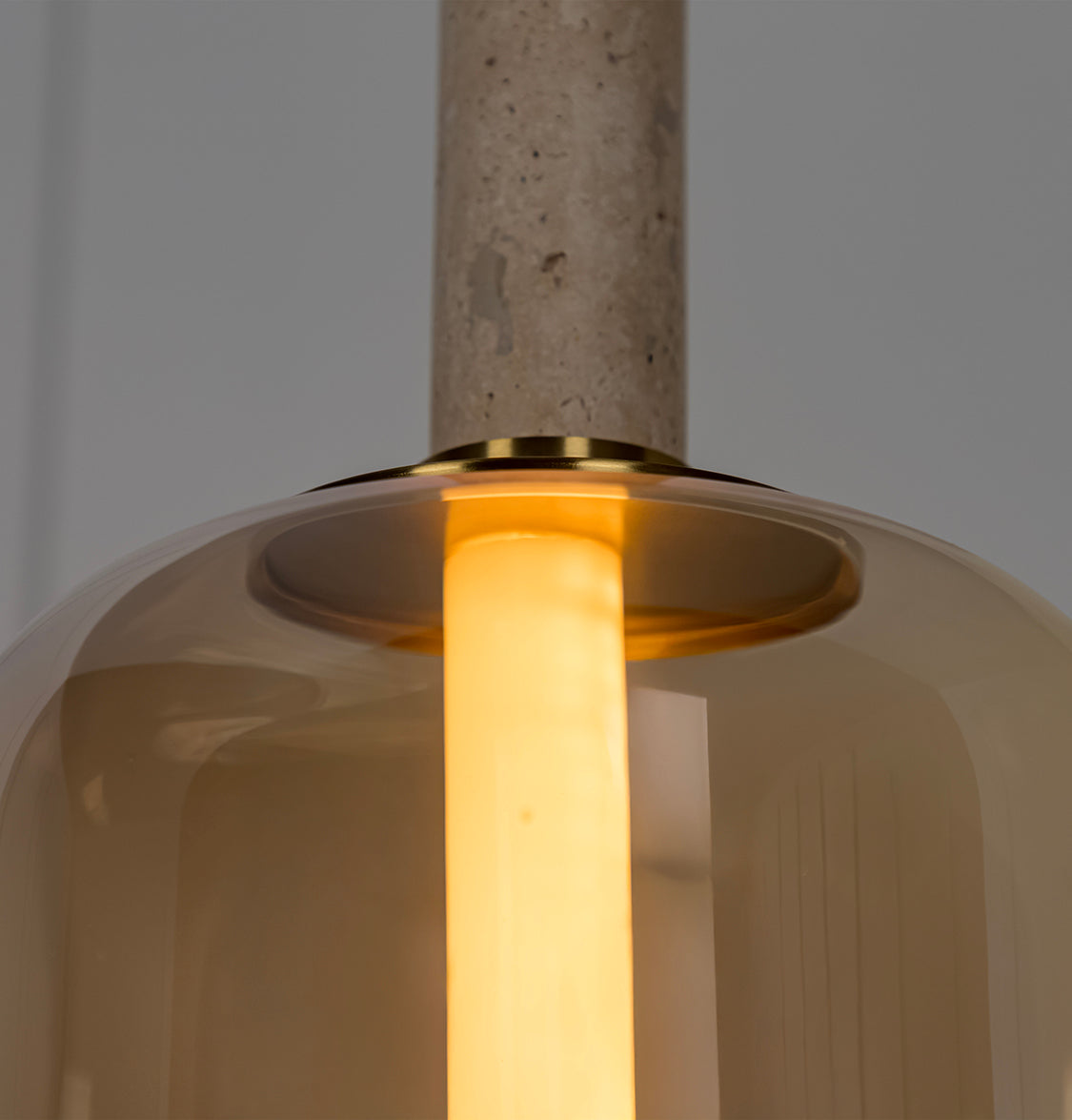 Siena Tekli Sarkıt, sıcak tonlu bal cam gövdesi ve doğal traverten taş detaylarıyla bulunduğu ortama yumuşak, davetkâr bir atmosfer kazandırır. Modern formlu bu tasarım, gün ışığı LED aydınlatmasıyla birleştiğinde iç mekânda hem fonksiyonel hem dekoratif bir vurguya dönüşür.