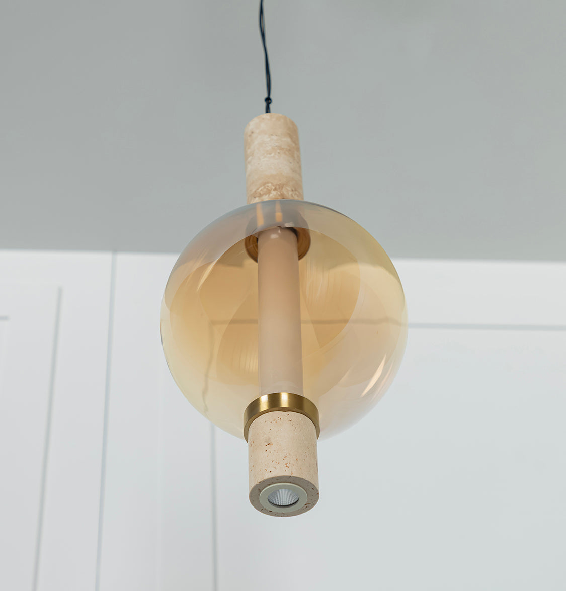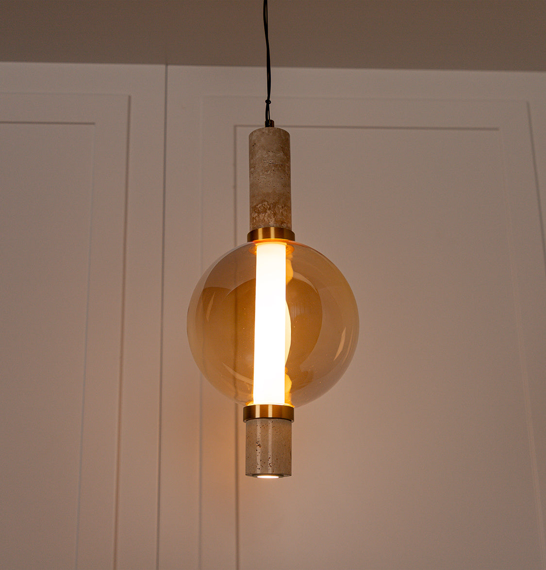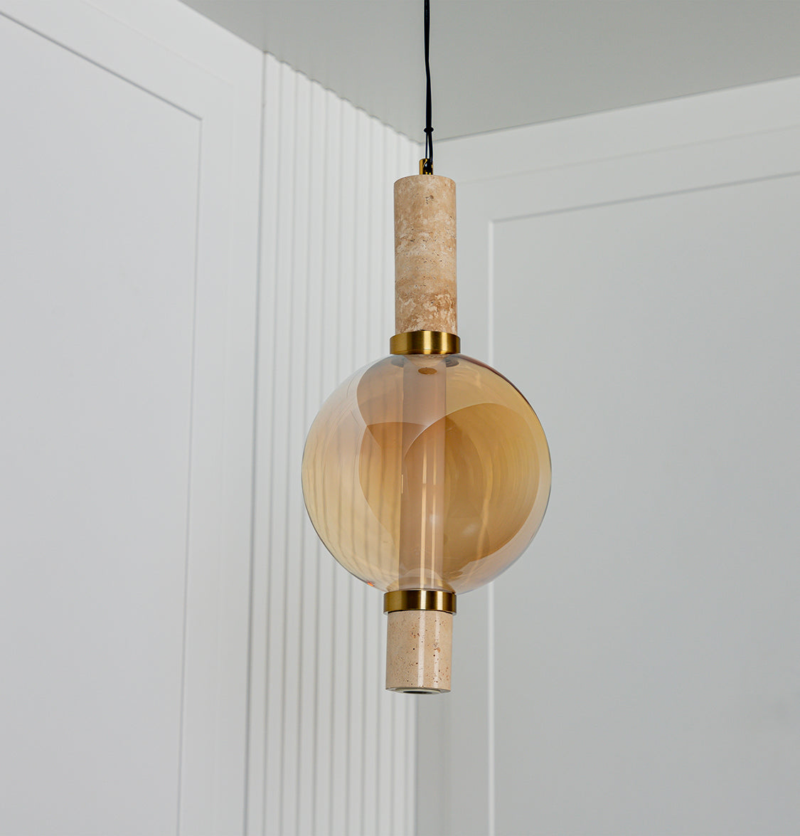 Siena Tekli Sarkıt, doğal traverten taşı ve bal camın dengeli birlikteliğiyle, modern iç mekanlara zarif bir karakter kazandırır. Dikey silindirin ortasında yer alan bal cam küre, ışığın hem yansımasını hem de yumuşak bir geçişle yayılmasını sağlar.