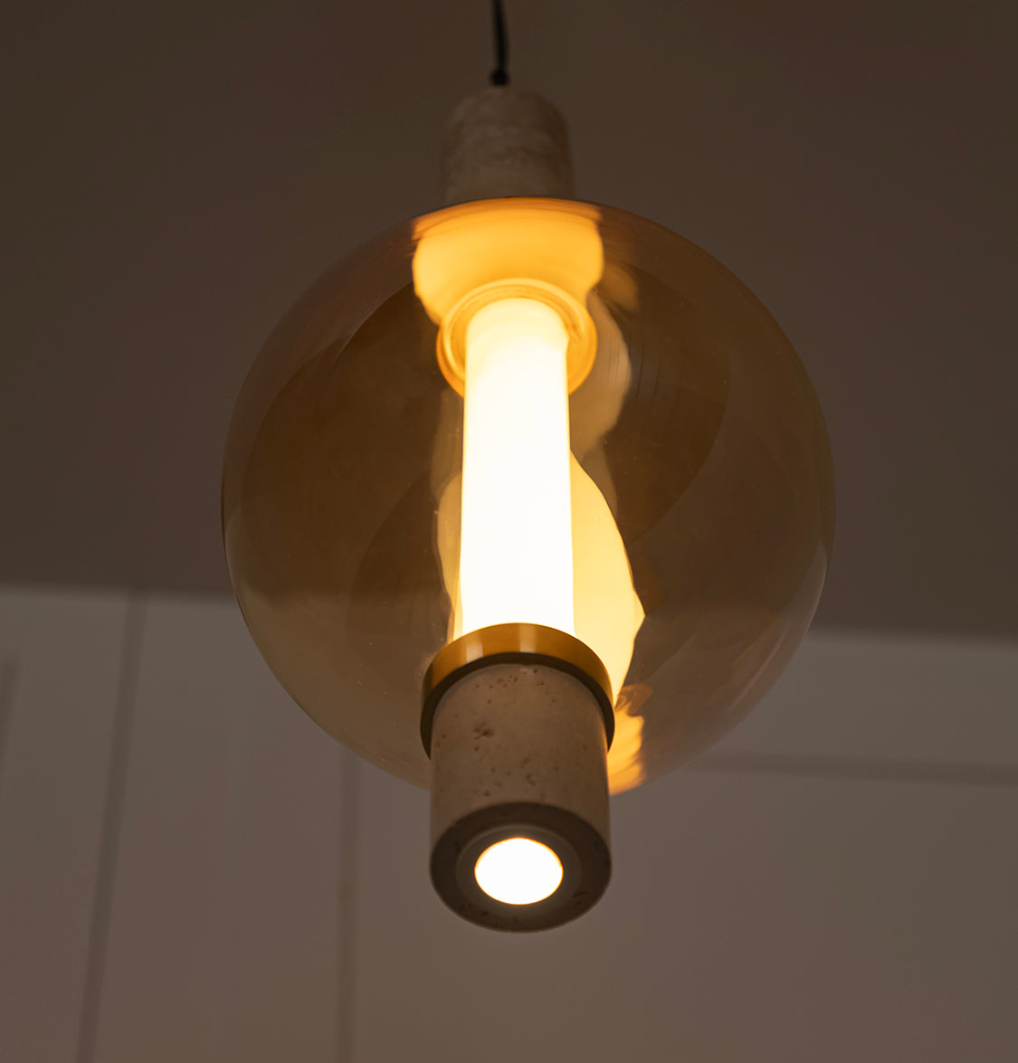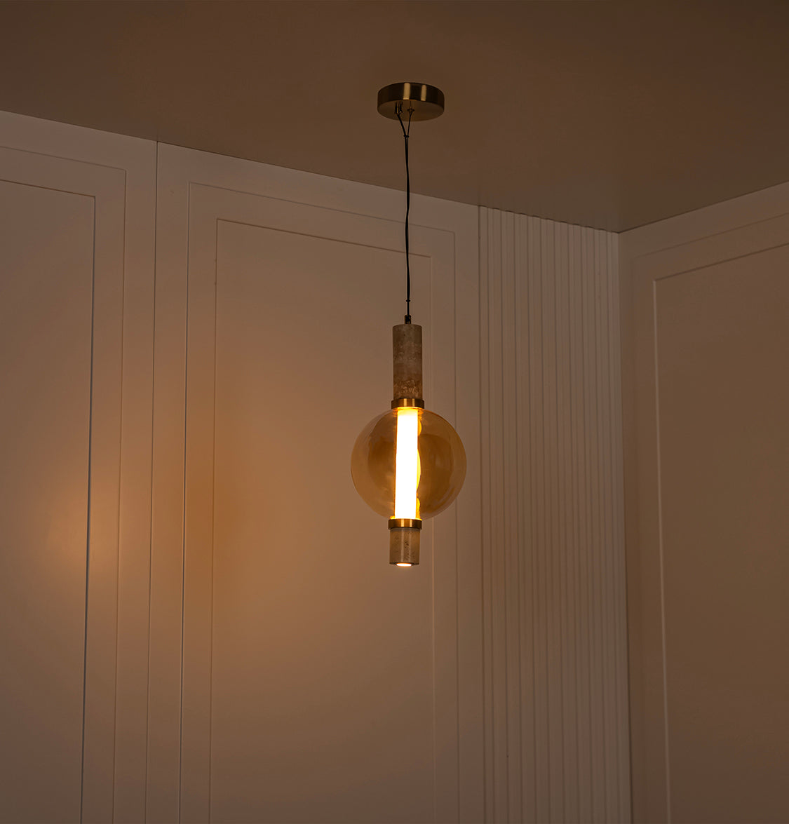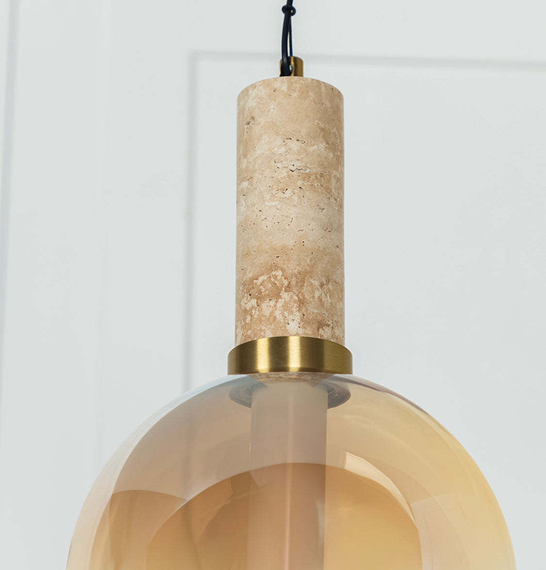 Siena Tekli Sarkıt, doğal traverten taşı ve bal camın dengeli birlikteliğiyle, modern iç mekanlara zarif bir karakter kazandırır. Dikey silindirin ortasında yer alan bal cam küre, ışığın hem yansımasını hem de yumuşak bir geçişle yayılmasını sağlar.