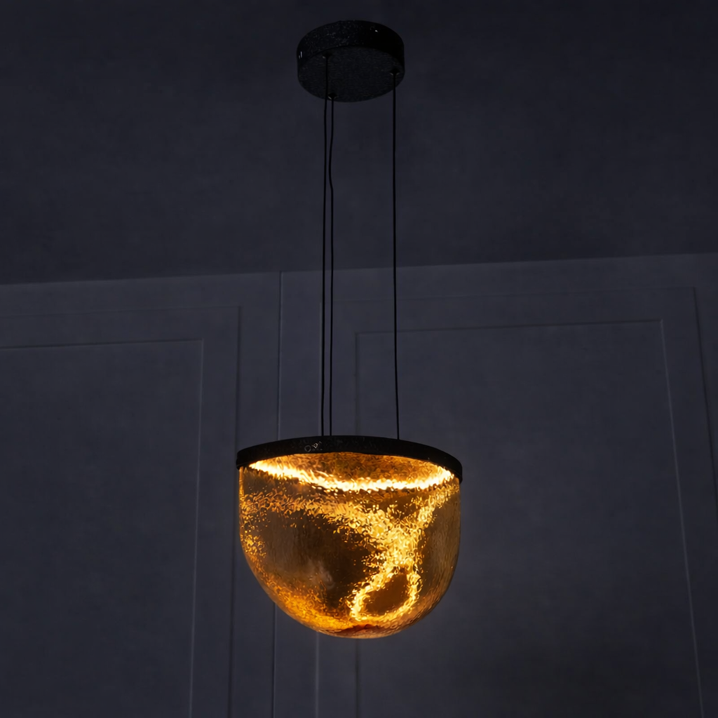 Gambia Avize, bal rengi camın doğal sıcaklığı ile siyah metal gövdenin güçlü duruşunu buluşturan rafine bir tasarımdır. Organik formdaki cam yüzey, ışığı kırarak yumuşak bir şekilde mekâna yayar. El işçiliğini andıran dokusu, her açıdan farklı bir yansıma oluşturarak avizeyi yalnızca bir aydınlatma ürünü değil, aynı zamanda dekoratif bir parça haline getirir.