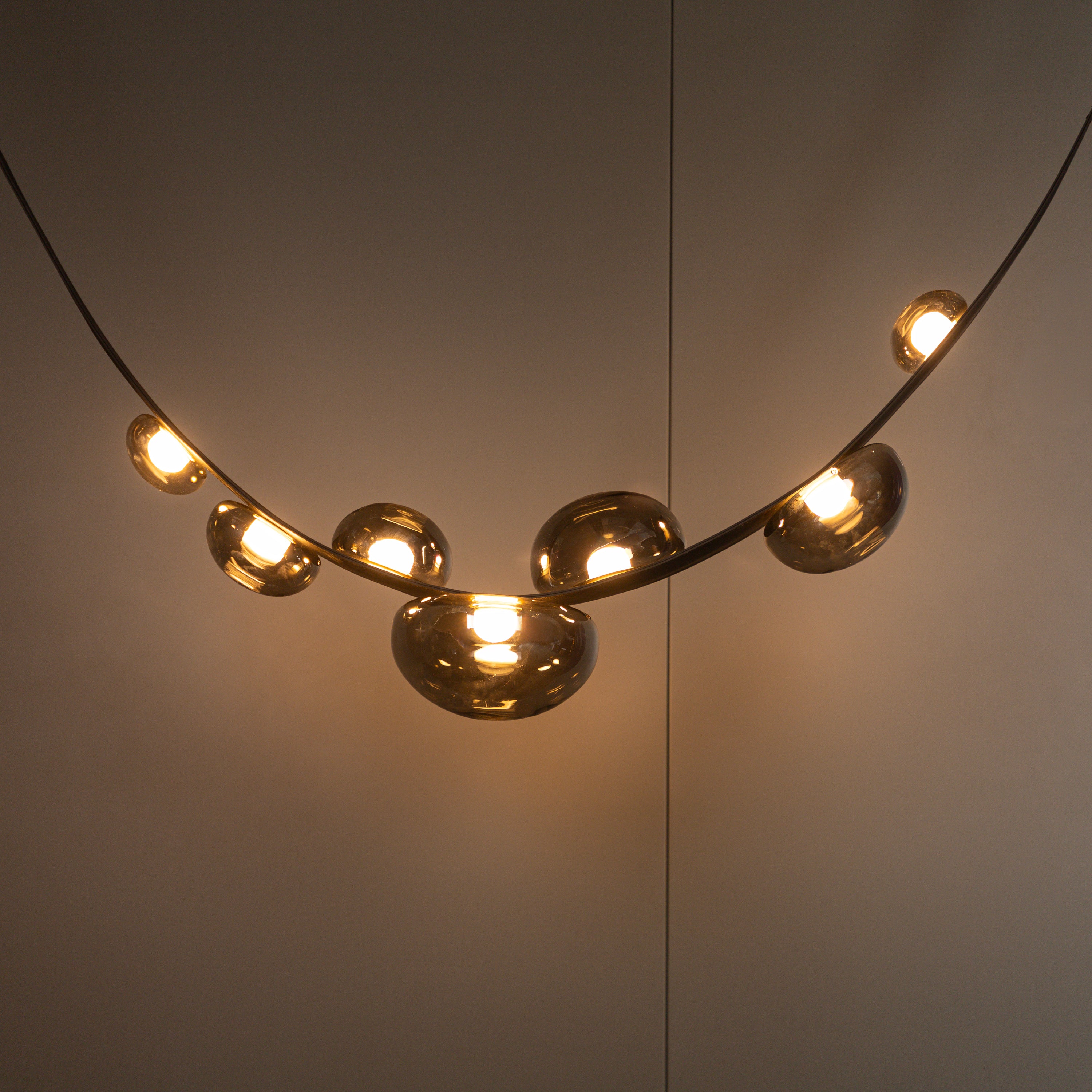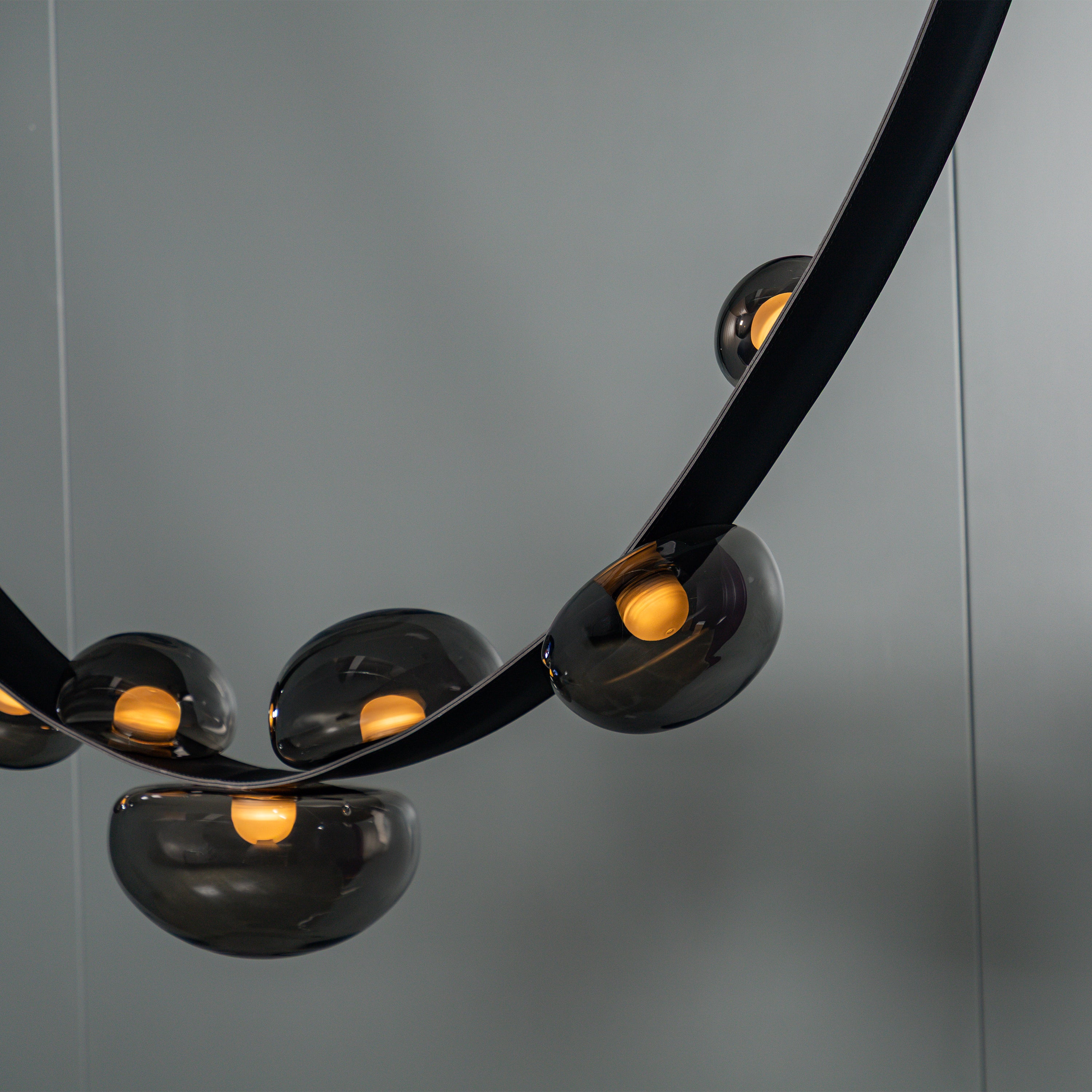 Labranda Avize, füme cam kürelerin siyah deri kemerlerle birleştiği güçlü bir tasarım anlayışını yansıtır. Yedi başlı formu sayesinde mekâna hacim kazandırırken, füme camın loş ve sofistike yansımalarıyla dikkat çeker. Deri detaylar, klasik dokulara çağdaş bir yorum katarak avizeye özgün bir karakter kazandırır.