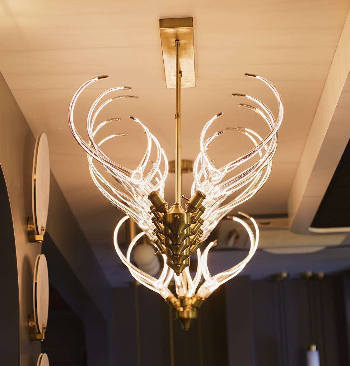 Galata Avize, eskitme tonlardaki metal gövdesini füme cam detaylarla birleştirerek zamansız bir şıklık sunar. On ampullük geniş yapısı, büyük yemek masalarının üzerinde ışığı dengeli ve çarpıcı bir biçimde yayar.