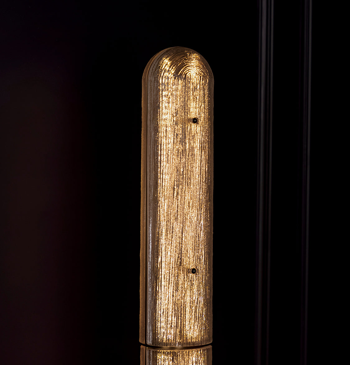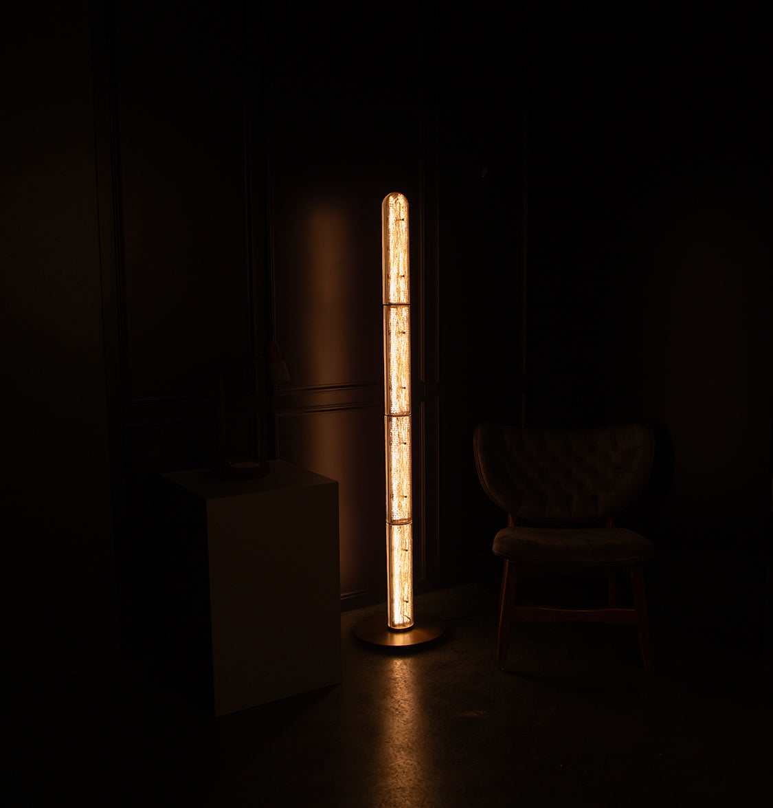 Buzlu camın içinden yayılan LED ışık, loş ve davetkâr bir atmosfer oluşturur ve eskitme gövdeyle harmanlanarak mekâna sıcak bir estetik kazandırır. Işık yalnızca işlevsel bir unsur olmaktan çıkar, yaşam alanının ruhuna dokunan bir tasarım detayı haline gelir.