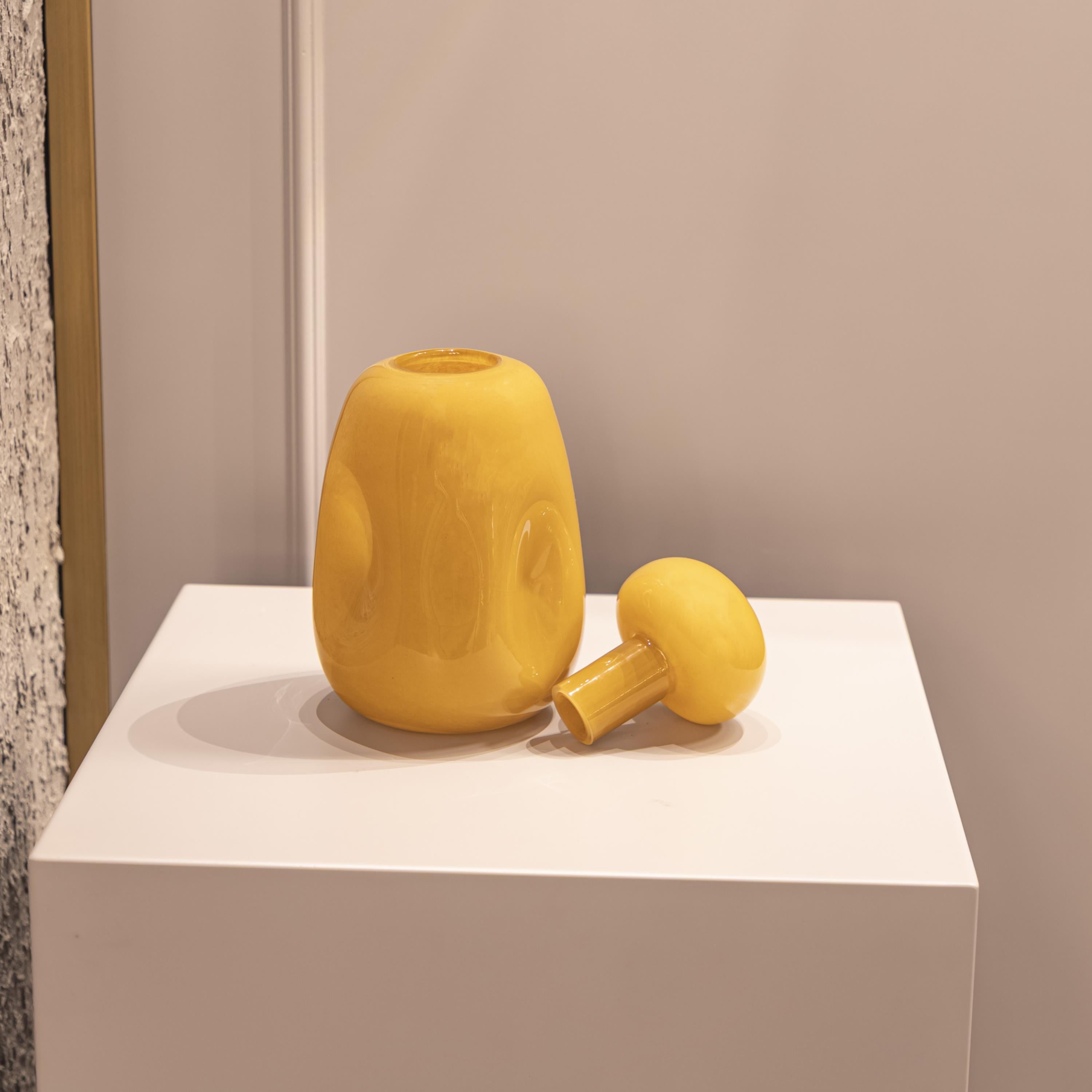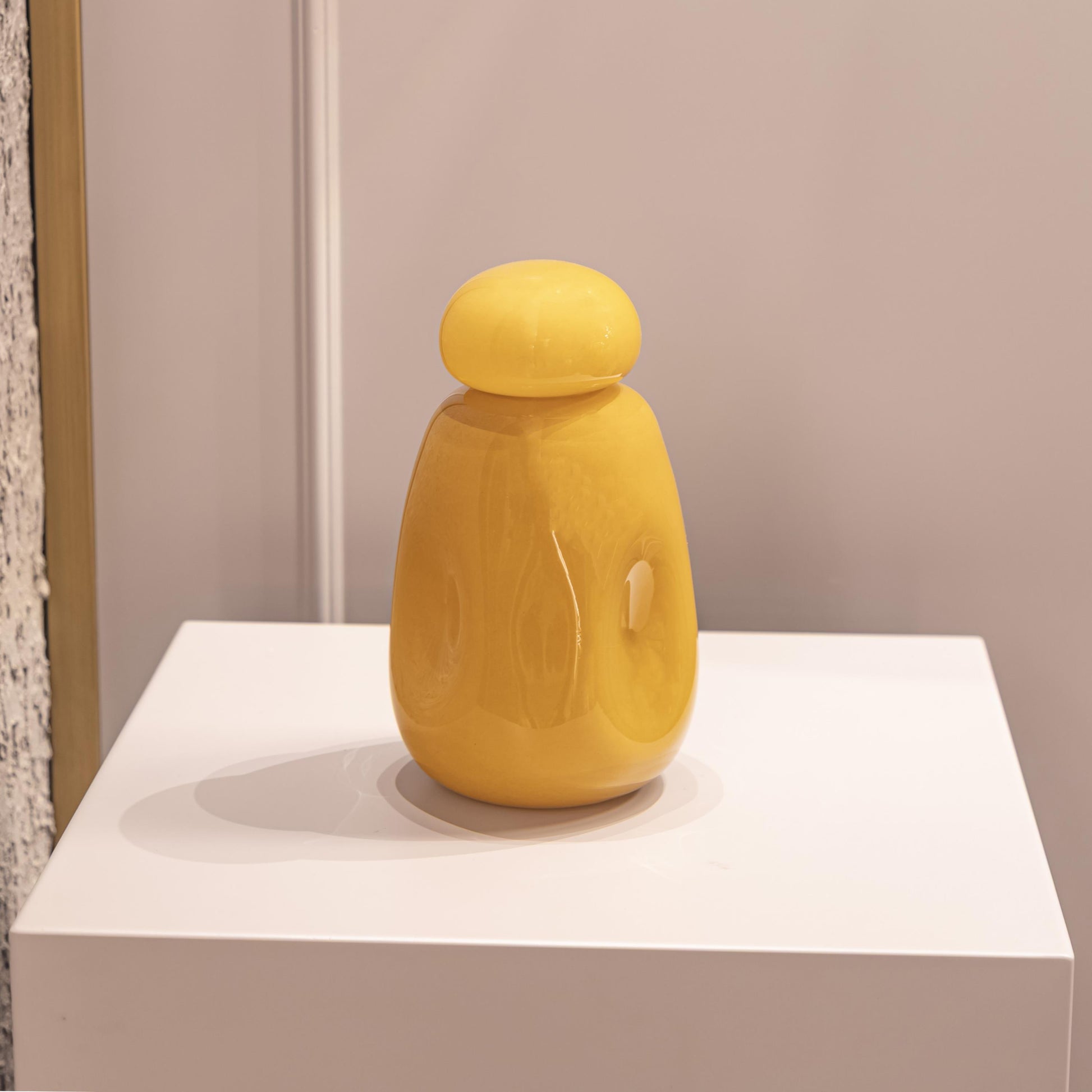 Karamel rengin doğal sıcaklığı, vazonun estetik bütünlüğünü oluşturan kapakla tamamlanarak heykelsi bir form ortaya çıkarır. Kapaklı yapısı sayesinde hem dekoratif bir obje hem de küçük eşyalar için saklama alanı olarak kullanılabilir. Tek başına sergilendiğinde modern bir vurgu parçası olurken, diğer cam aksesuarlarla bir araya geldiğinde mekâna harmonik bir renk dengesi sunar.