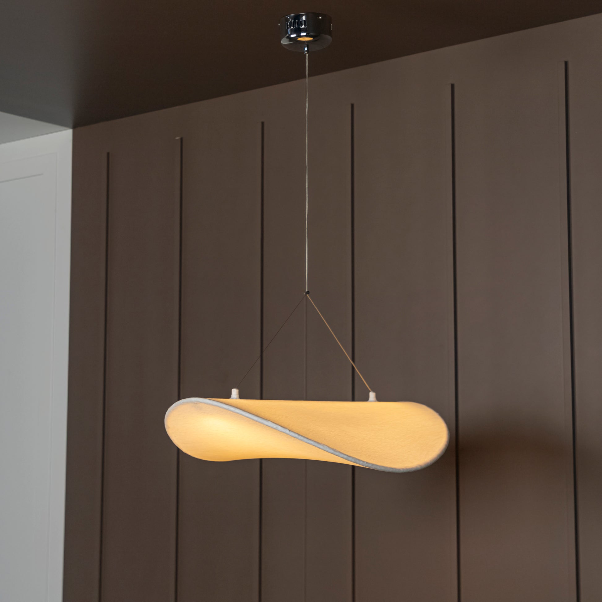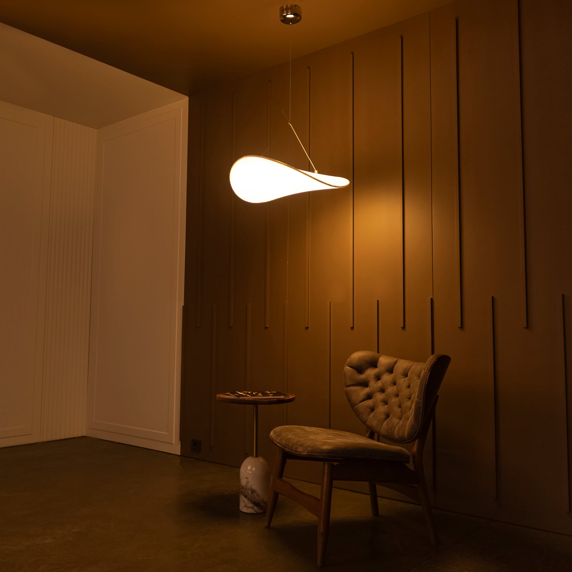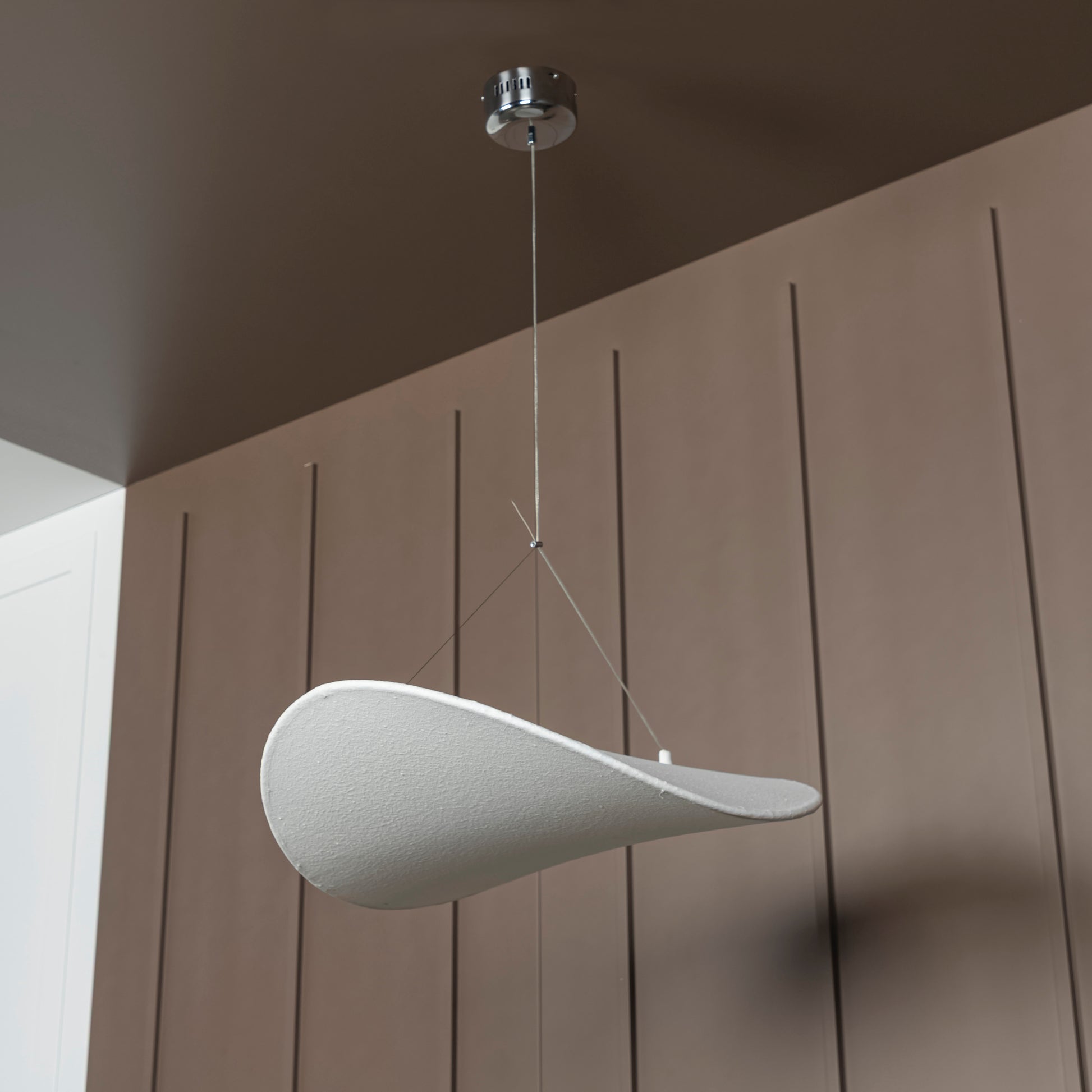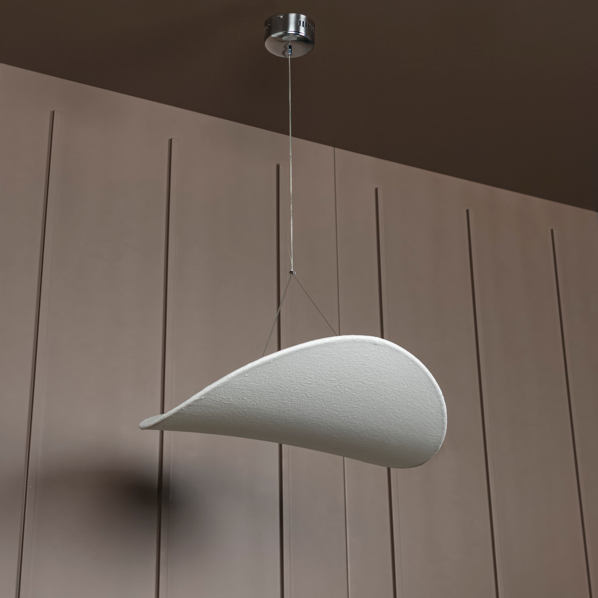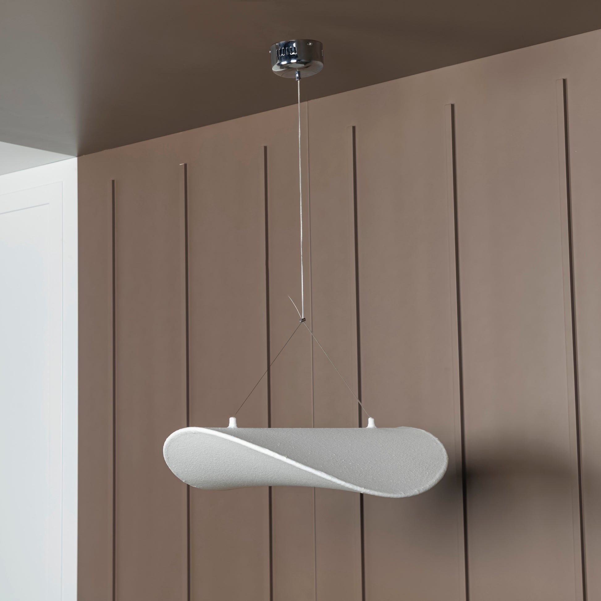 Galaxy Avize, dalga formlu tasarımı ve soft touch beyaz yüzeyiyle sade ama dinamik bir görünüm sunar. Polimer gövdesi, siyah metal detaylarla kontrast oluştururken, akışkan çizgileriyle modern mekânlara hareket kazandırır. Formu sayesinde ışığın yönünü yumuşakça kırar ve bulunduğu ortama huzurlu bir atmosfer katar.