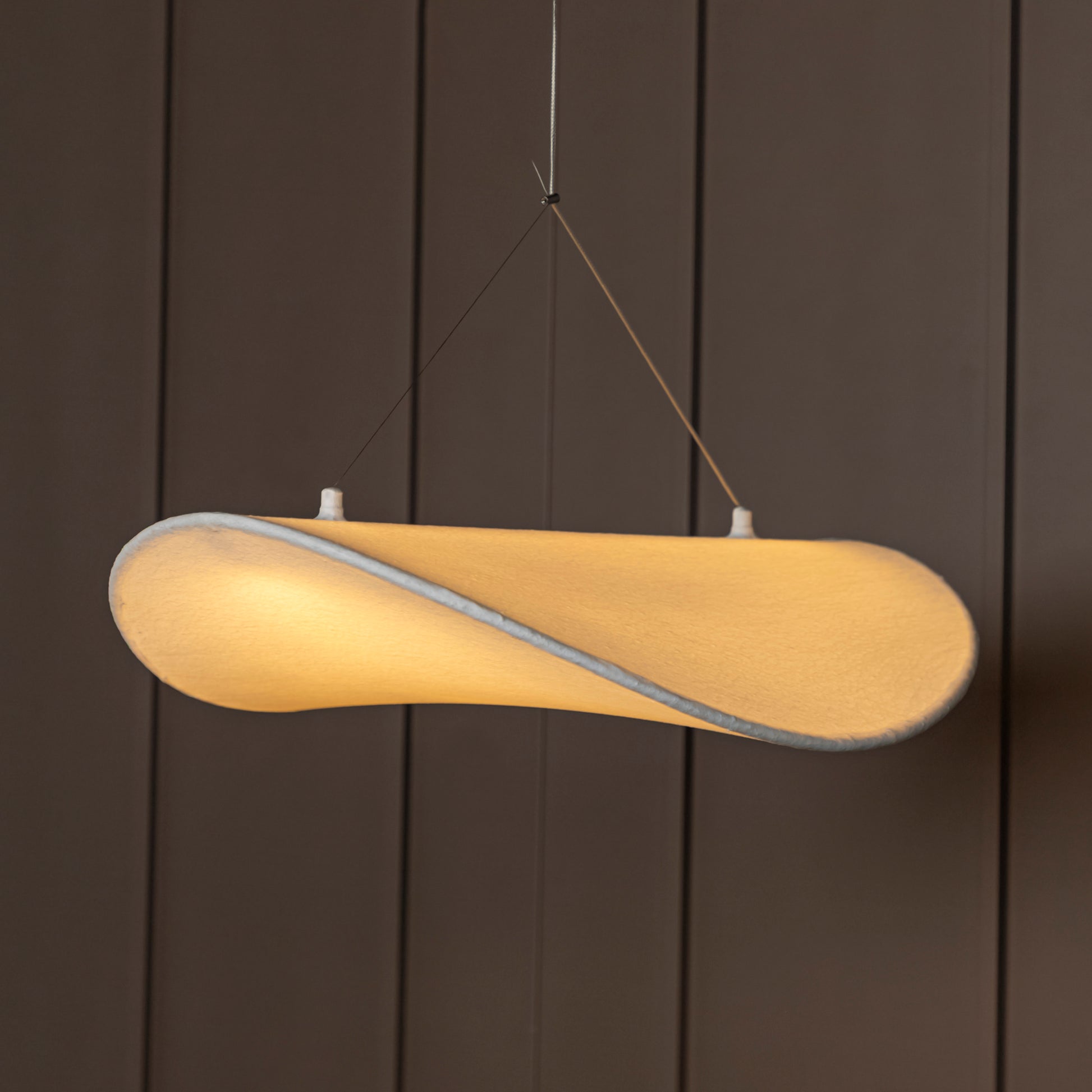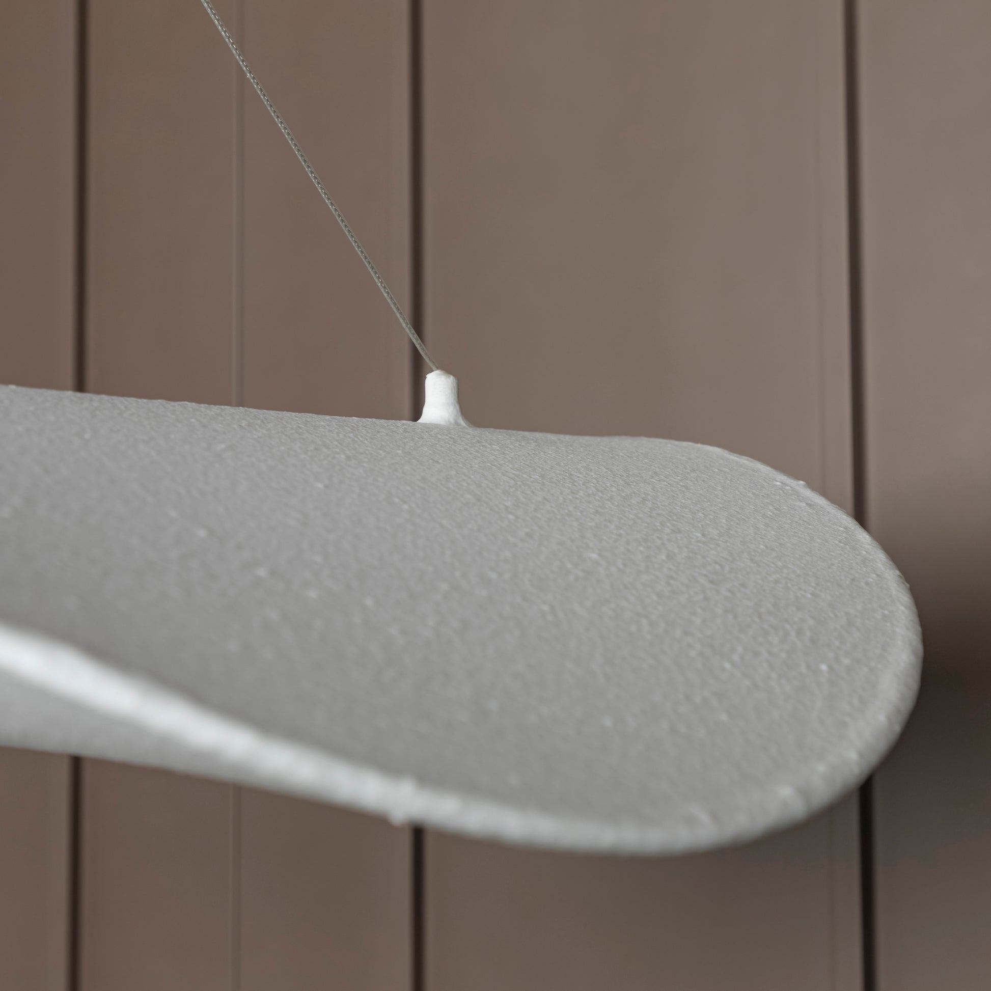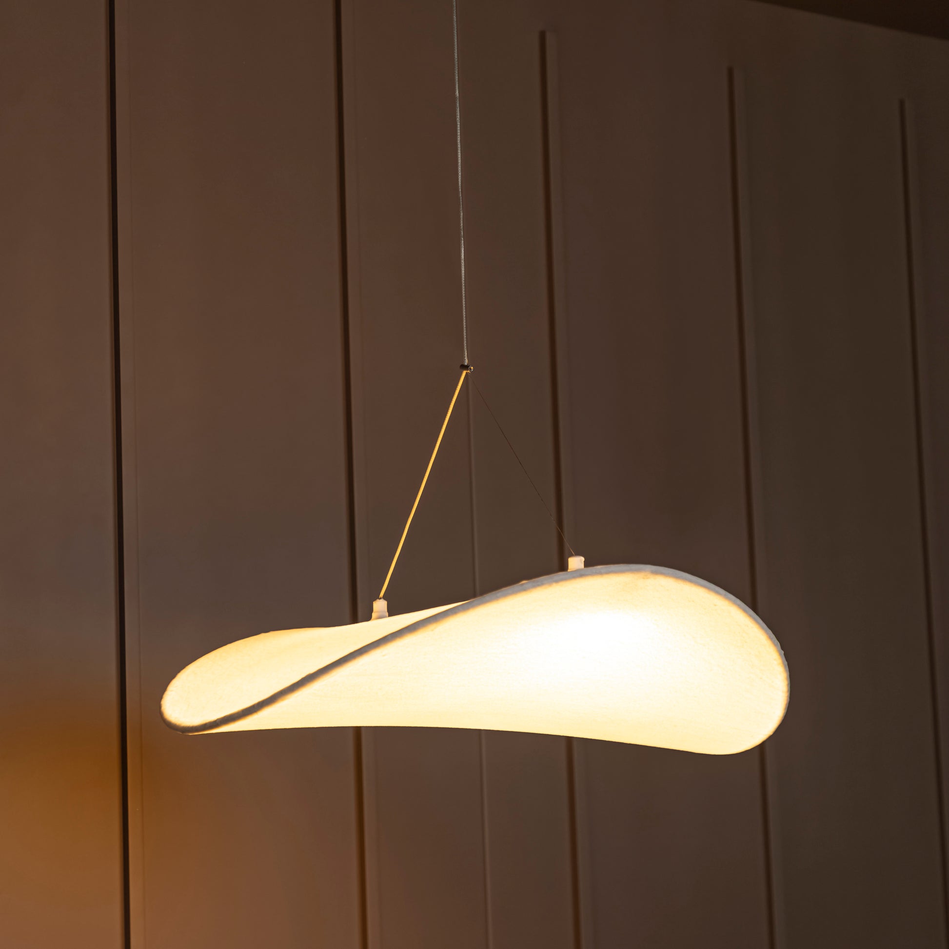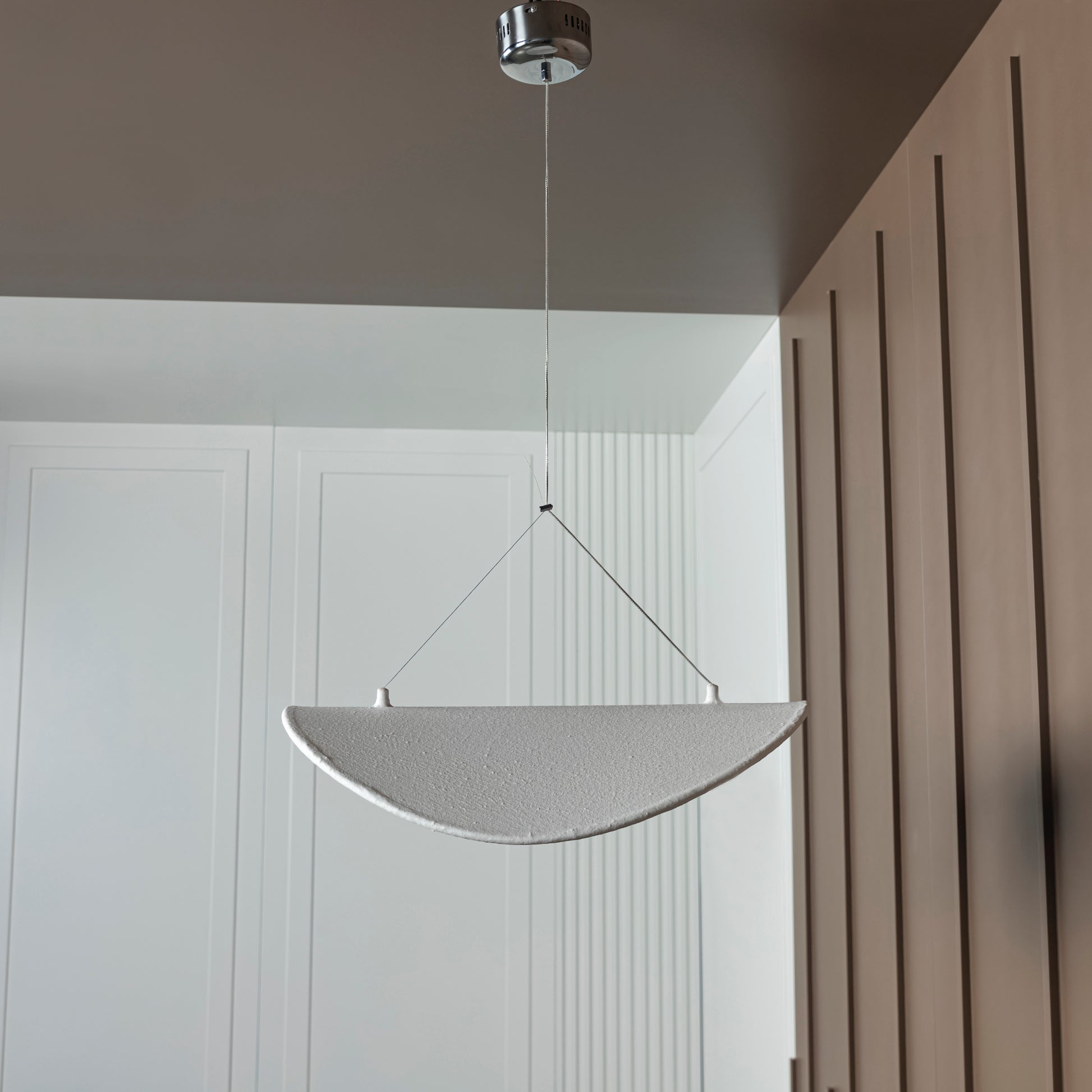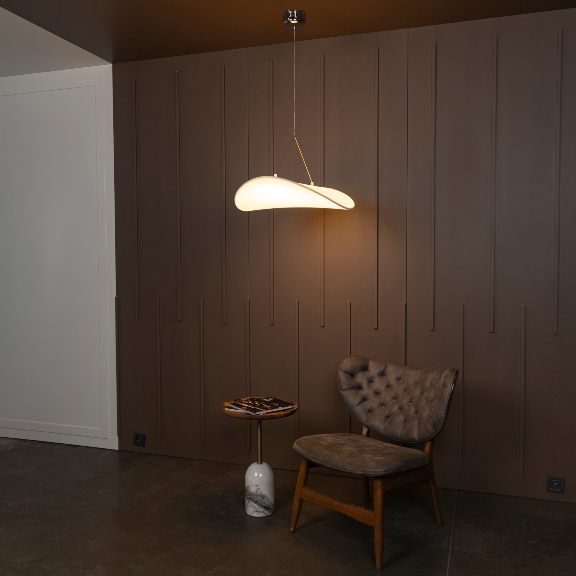 Galaxy Avize, dalga formlu tasarımı ve soft touch beyaz yüzeyiyle sade ama dinamik bir görünüm sunar. Polimer gövdesi, siyah metal detaylarla kontrast oluştururken, akışkan çizgileriyle modern mekânlara hareket kazandırır. Formu sayesinde ışığın yönünü yumuşakça kırar ve bulunduğu ortama huzurlu bir atmosfer katar.