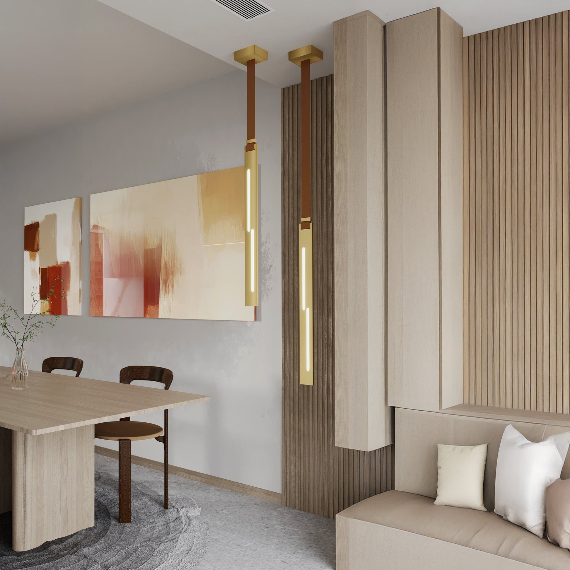 Lome Avize, kahverengi deri kaplama detayları ve eskitme metal gövdesiyle sıcak ve rafine bir atmosfer yaratır. Uzun ve ince formuyla dikkat çeken bu tasarım, özellikle yüksek tavanlı alanlarda güçlü bir dikey etki oluşturur. Derinin doğal dokusu ile metalin endüstriyel havası bir araya gelerek avizeye sofistike bir denge kazandırır.