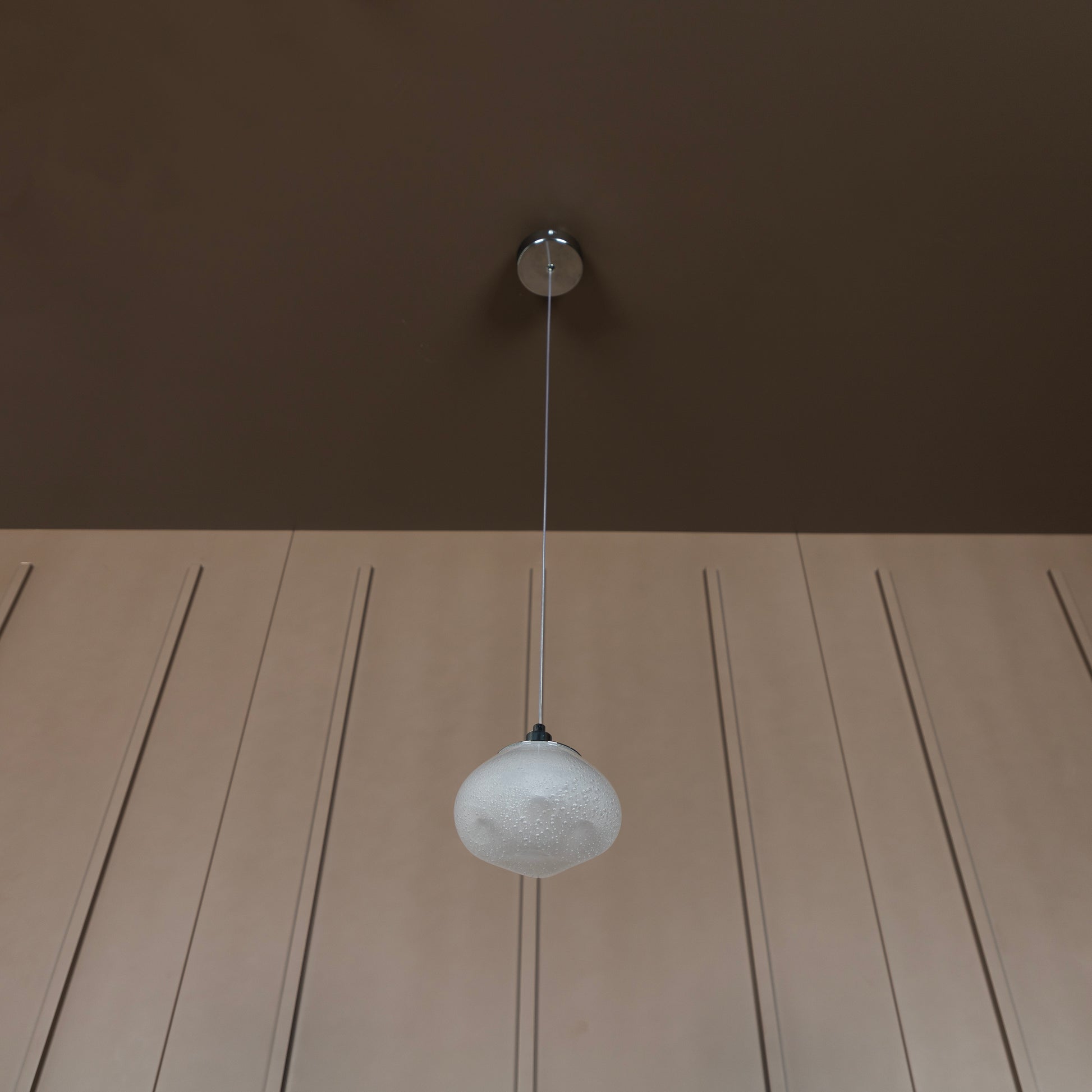 Odense Sarkıt Avize, krom metalin modern parlaklığını kabarcıklı soft camın zarif dokusuyla buluşturur. Basık formu sayesinde ışık, camın içindeki kabarcıklar arasından süzülerek mekânda yumuşak ve büyüleyici bir oyun sergiler.