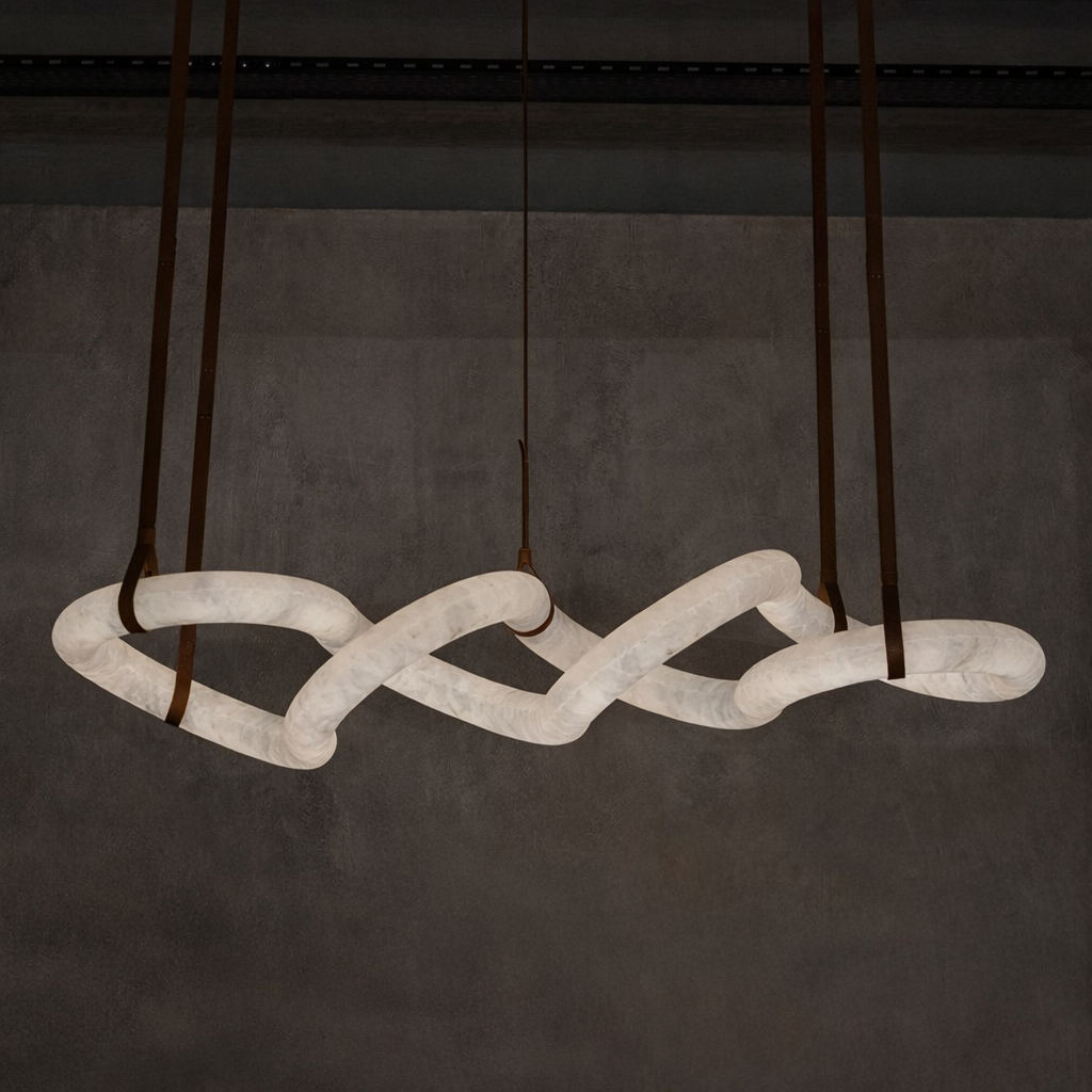 Venüs Sarkıt Avize, doğal mermerin zarif yapısı ve kahverengi deri askılarla oluşturduğu eşsiz kompozisyonuyla öne çıkar. Organik formda şekillendirilmiş mermer halka, ışığın içinde yumuşakça dağılmasını sağlayarak hem modern hem de sıcak bir atmosfer yaratır.