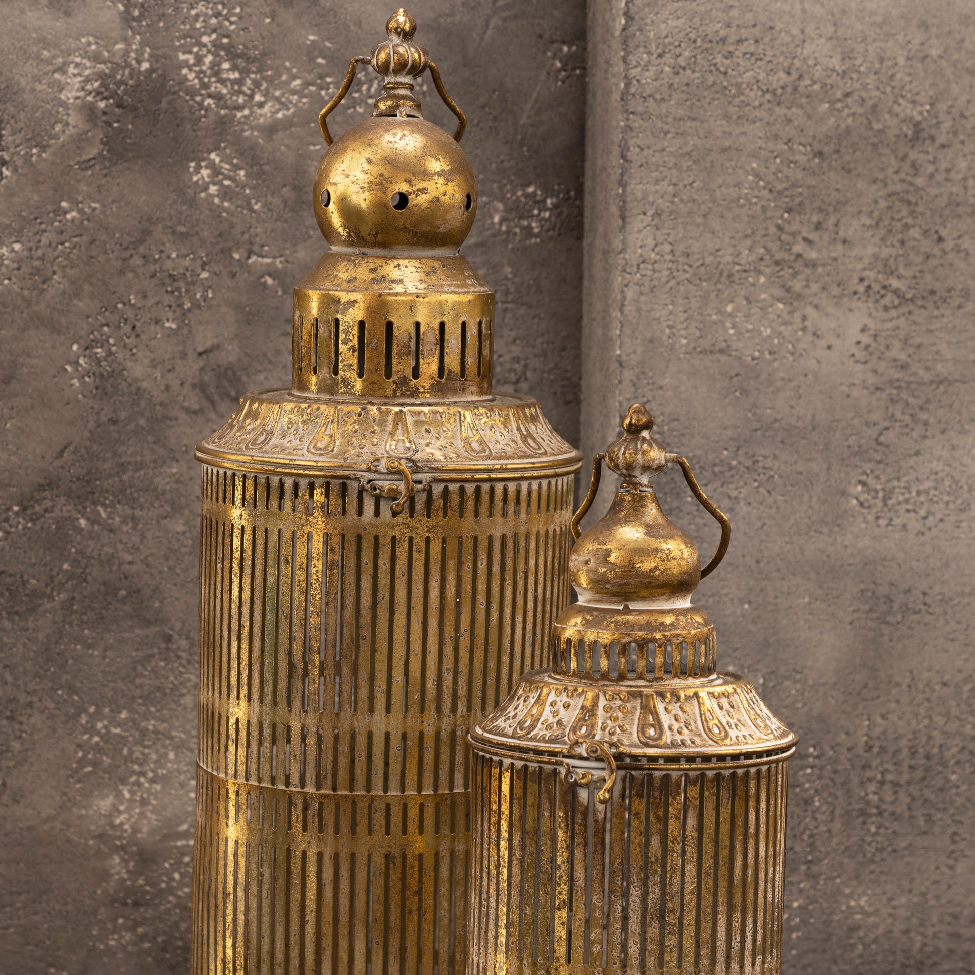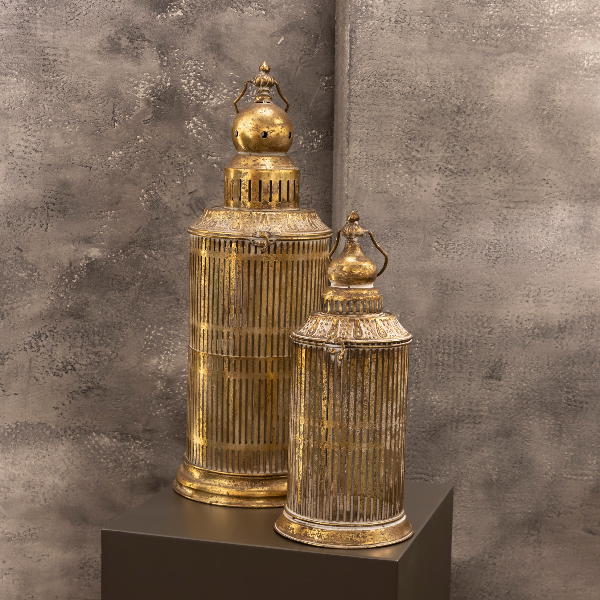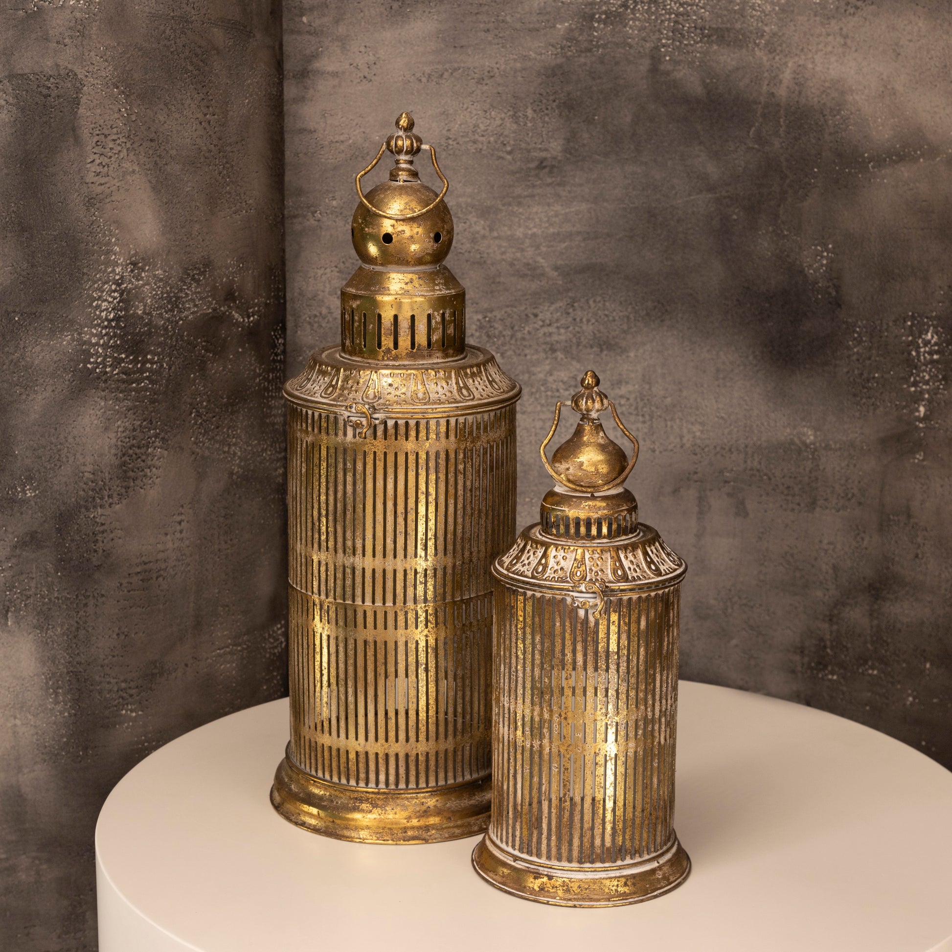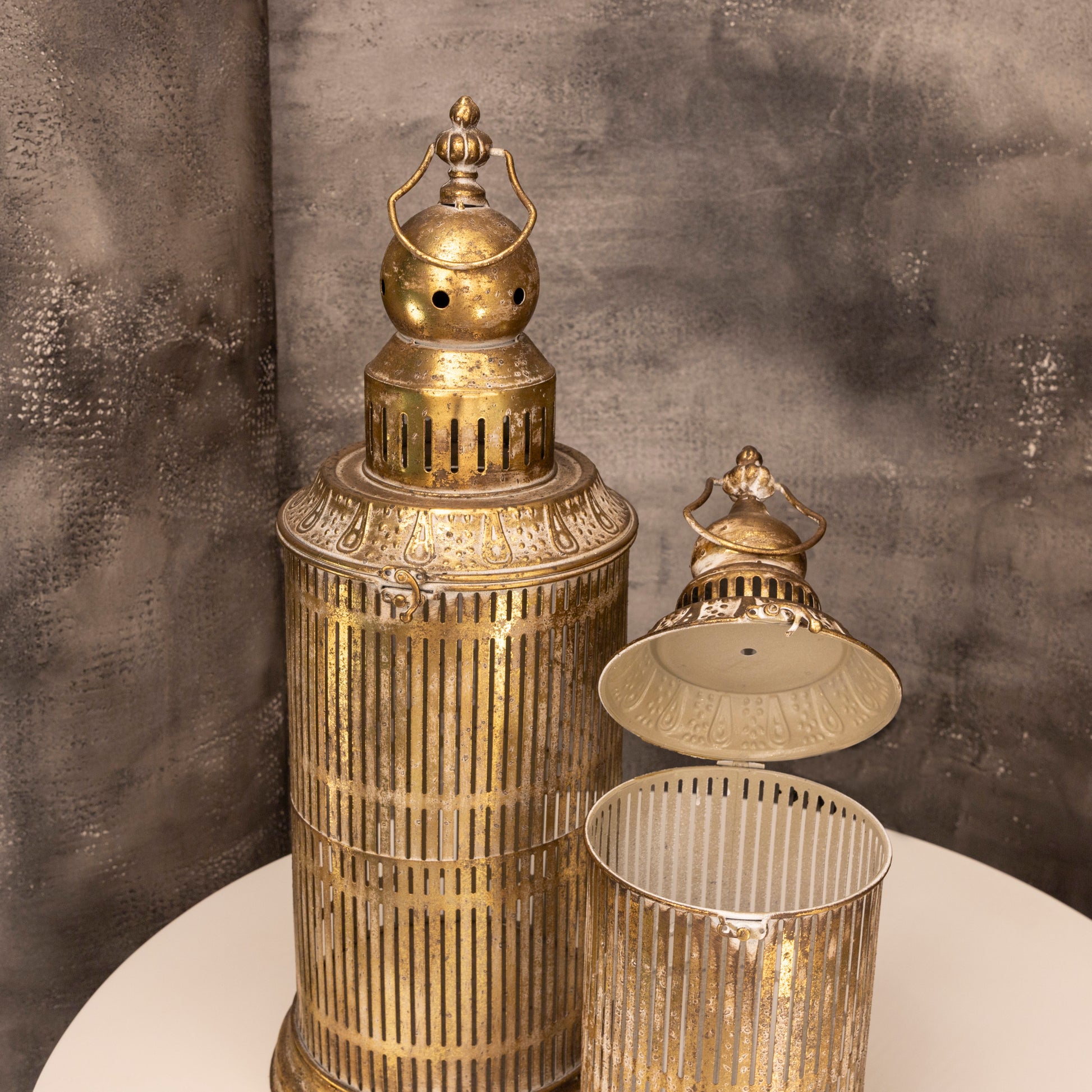 2’li Metal Dekoratif Fener, eskitme yüzey dokusuyla nostaljik bir atmosfer yaratır. Farklı boyutlardaki tasarımıyla dengeli bir kompozisyon oluşturur.