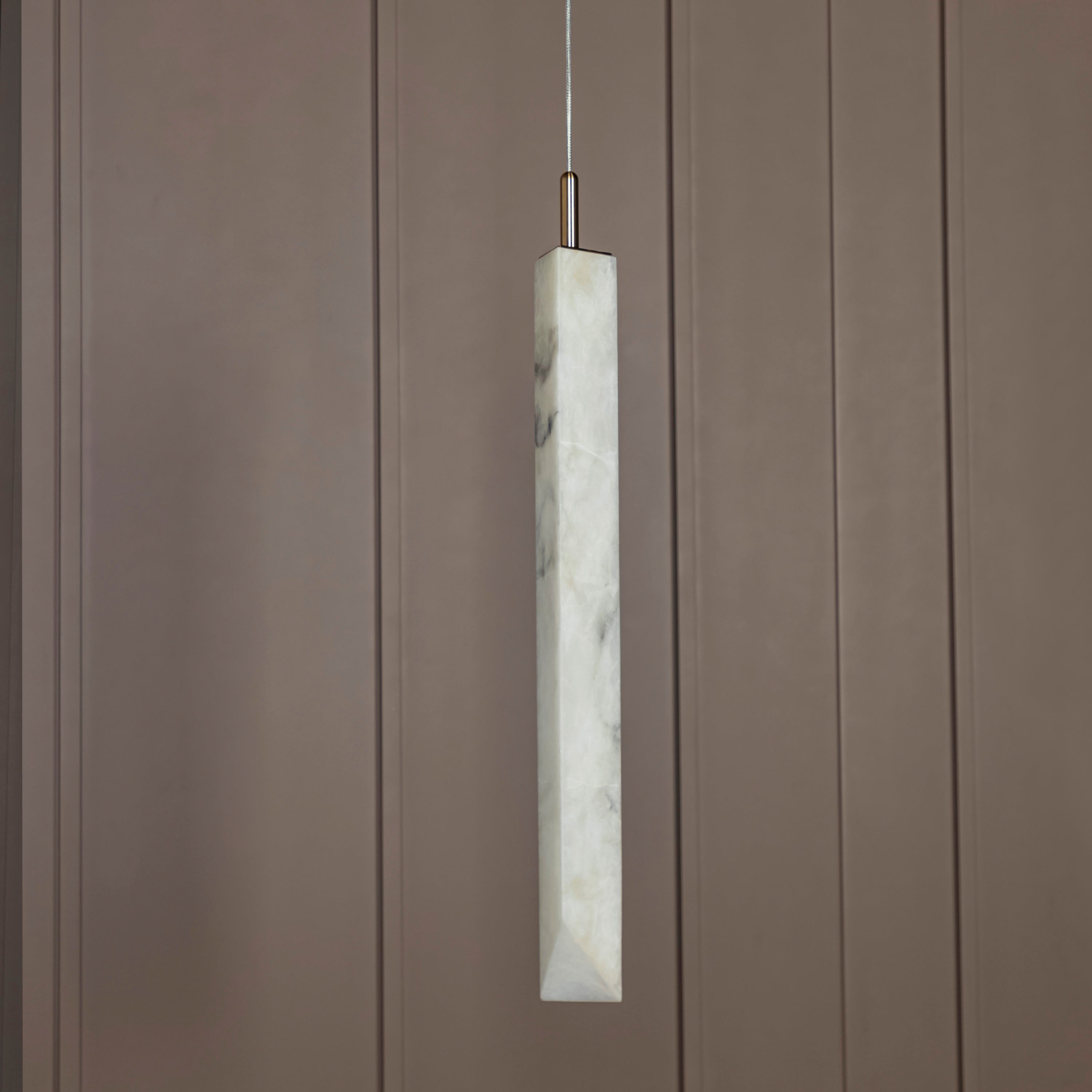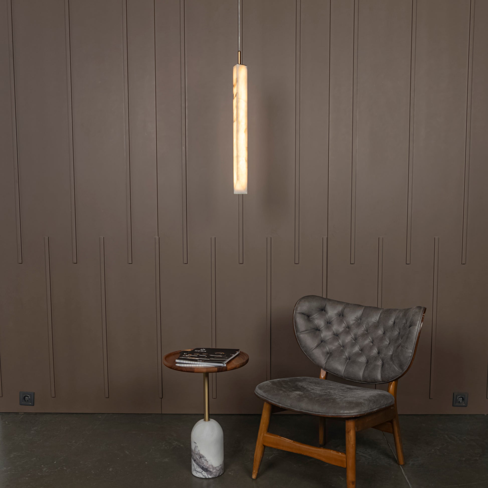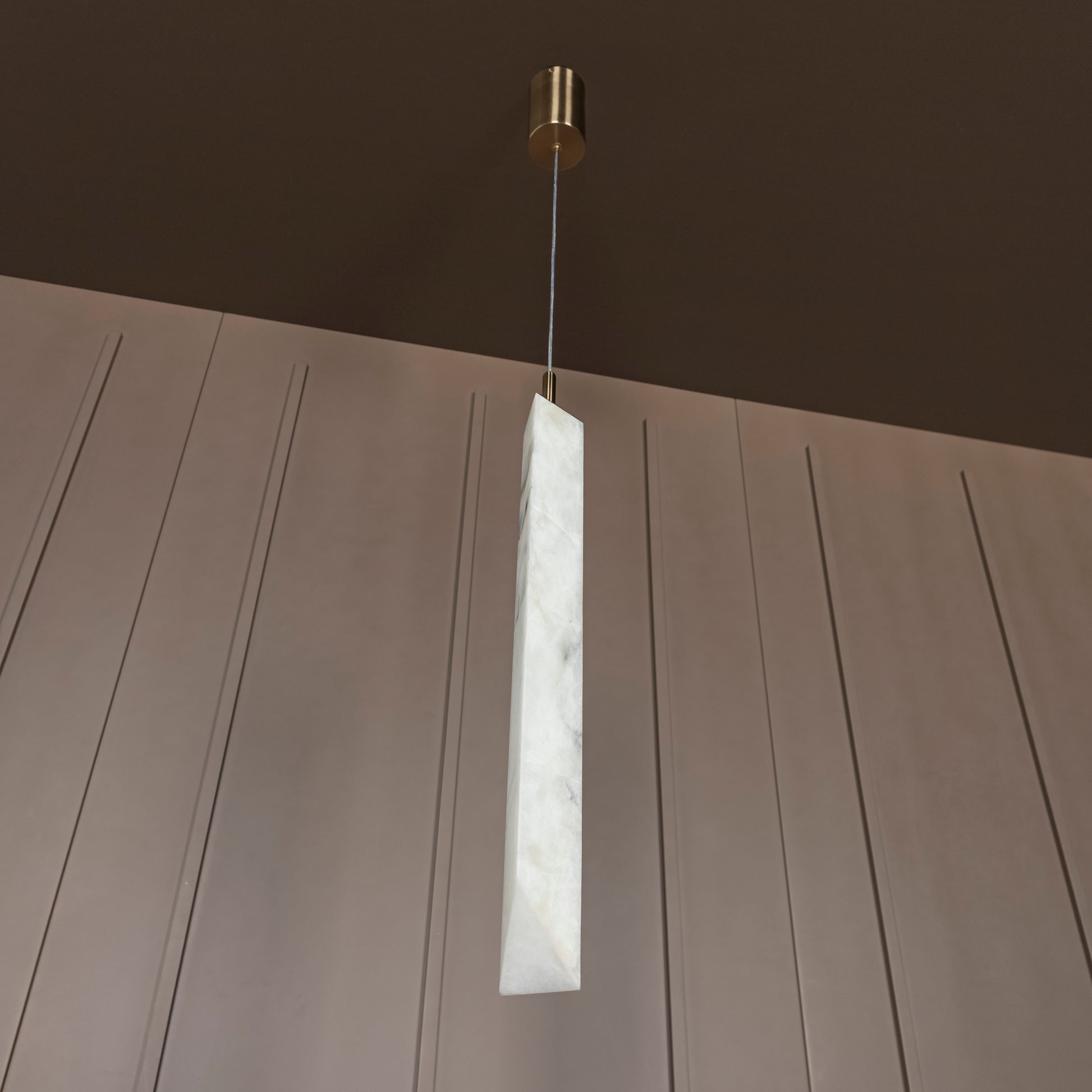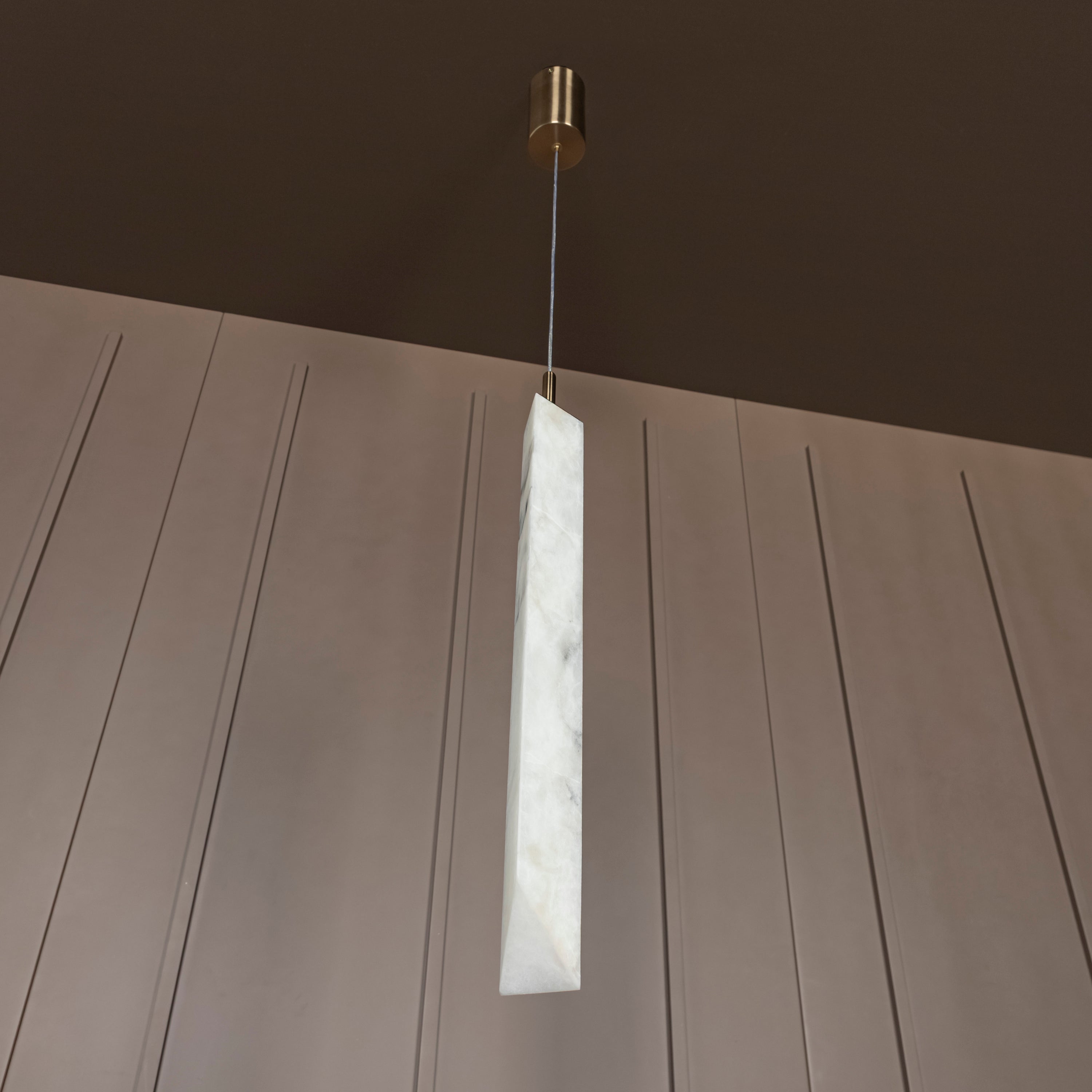 Aron Mermer Sarkıt, doğal beyaz mermer gövdesiyle mekânlara lüks ve minimalist bir dokunuş kazandırırken, eskitme metal detaylarla zarif ve çağdaş tasarımı bir araya getirir. Uzun silindirik mermer formuyla özgün ve modern çizgilere sahip olan Aron, yemek masası ve mutfak adası gibi alanlarda göz alıcı bir aydınlatma öğesi olur.
