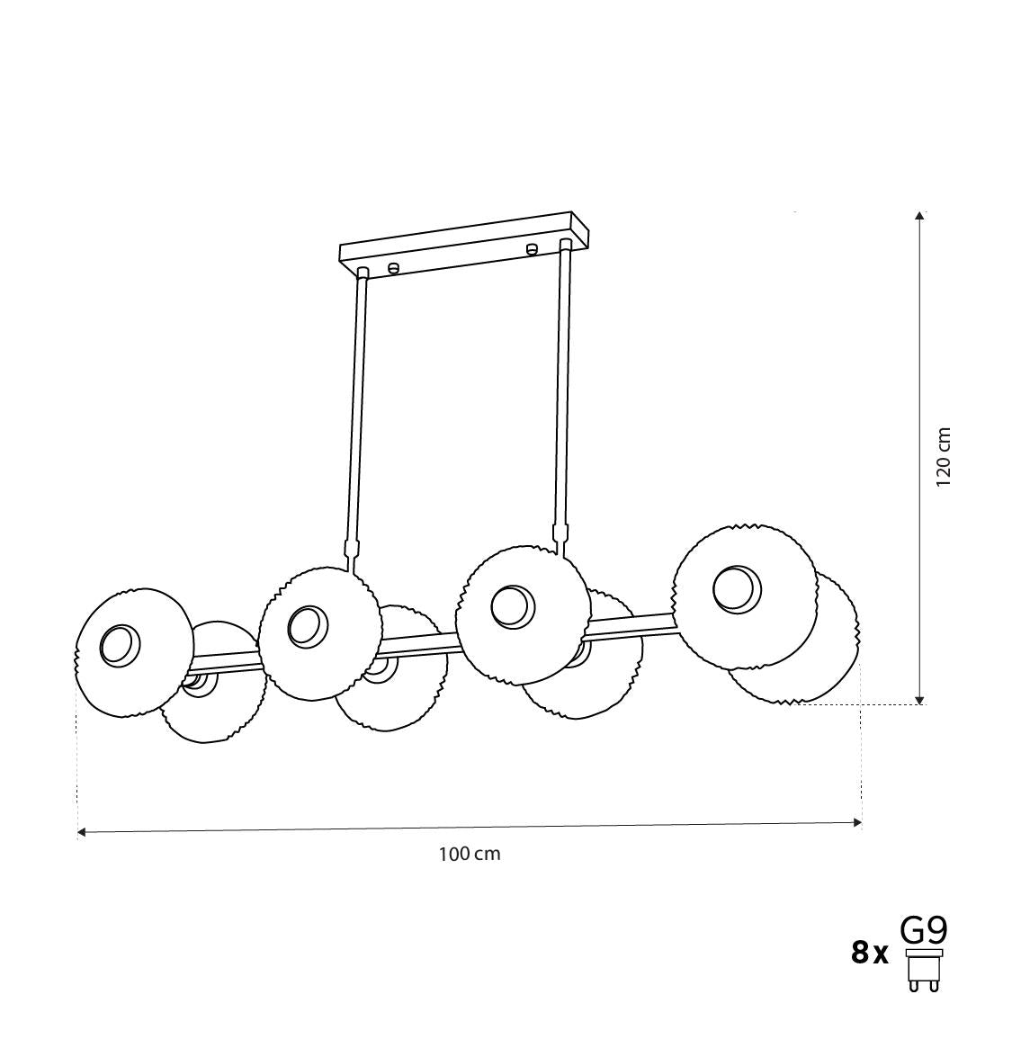 G9 ampuller, ışığı homojen bir şekilde yayarak geniş masaların tüm yüzeyini dengeli biçimde aydınlatır. Aspar, özellikle geniş yemek masalarında dekoratif bir vurgu unsuru oluşturur.