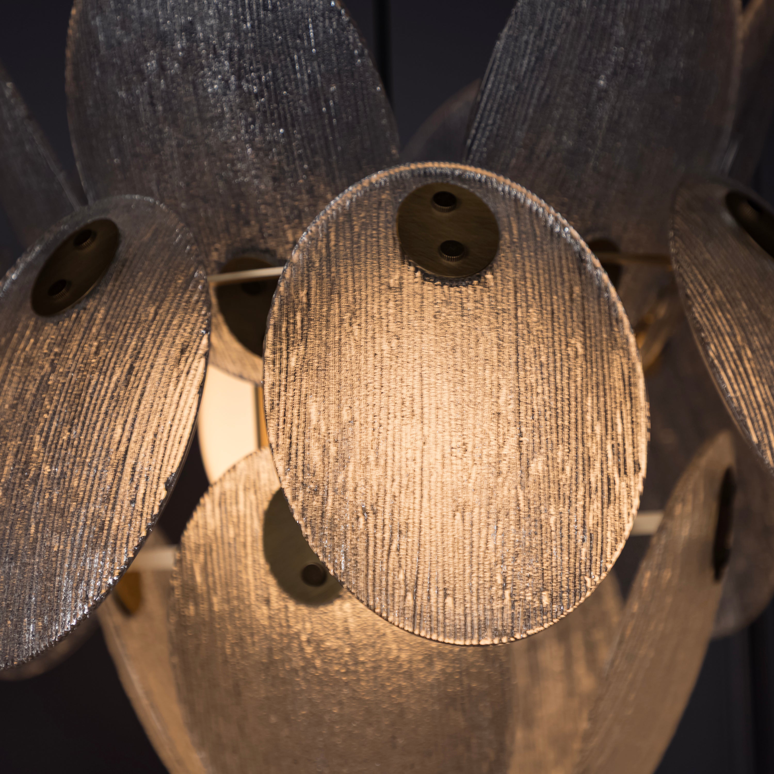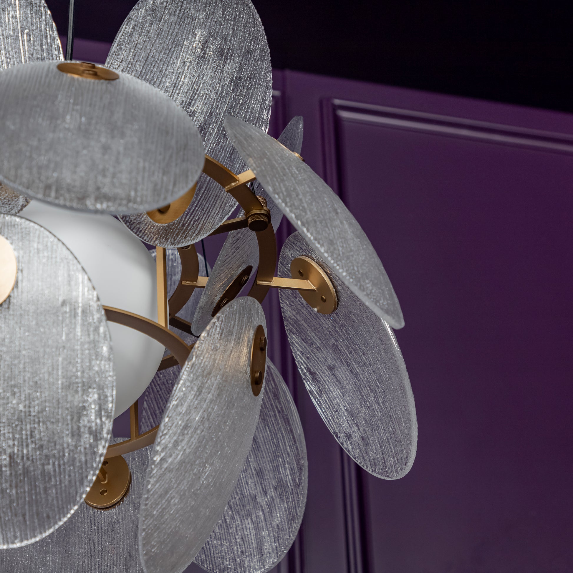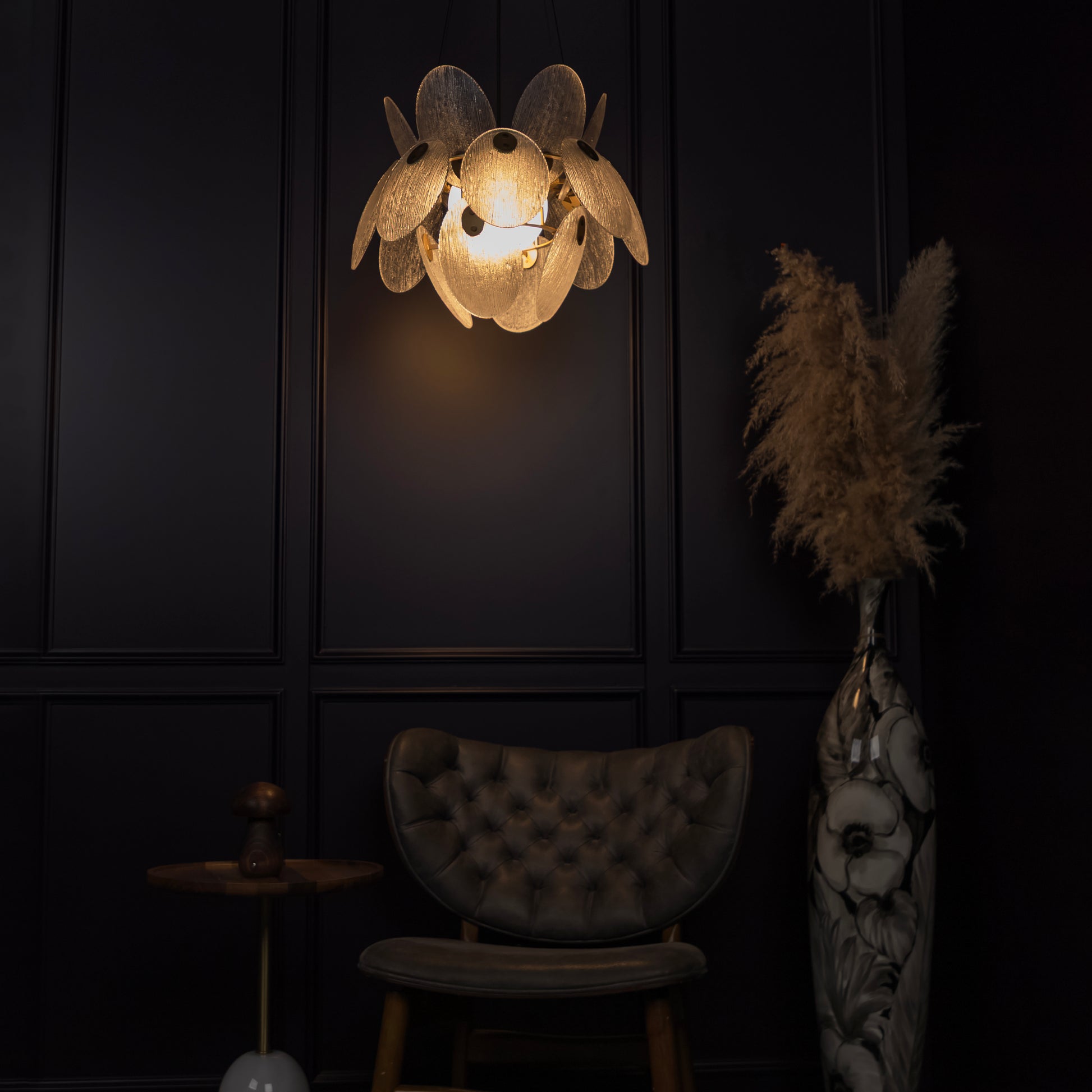 Gana Avize, beyaz buzlu cam küreleri ve eskitme metal gövdesiyle iç mekânlara zarif bir denge kazandırır. Camın yarı geçirgen dokusu, ışığı yumuşak ve homojen şekilde yayarak ortama huzurlu bir atmosfer sunar. Eskitme yüzeyli metal iskelet ise tasarıma klasik dokunuşlar eklerken dayanıklılığı da artırır.