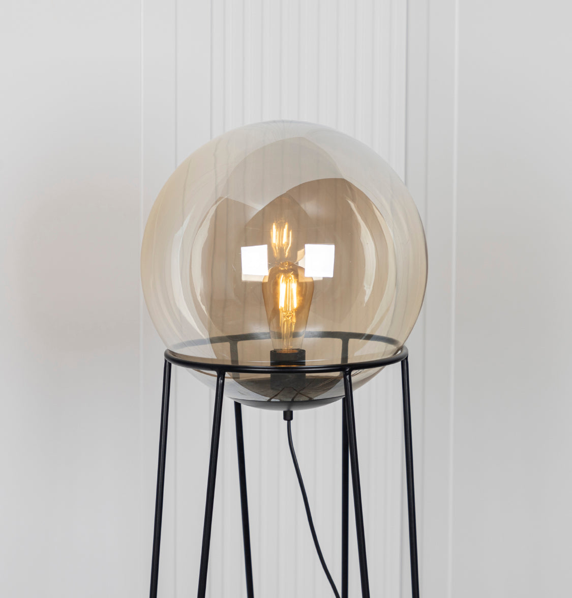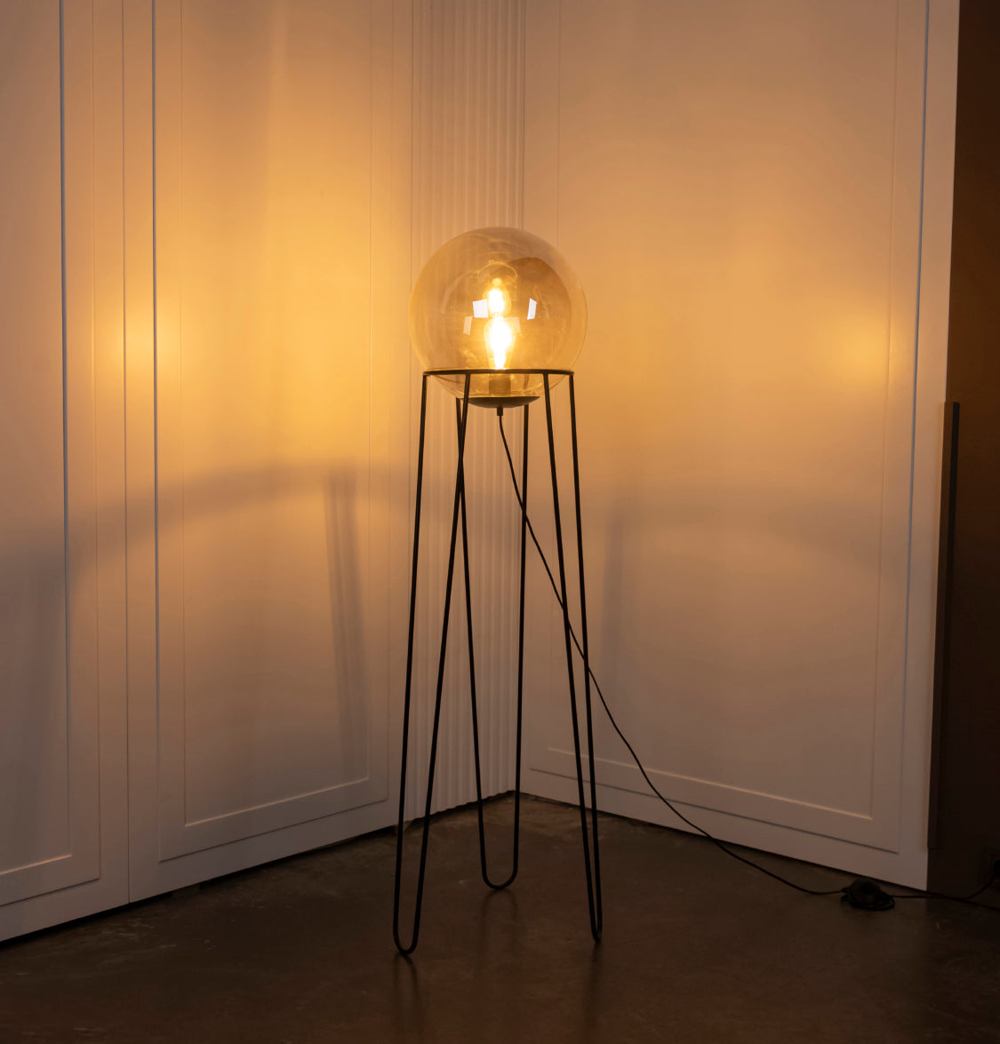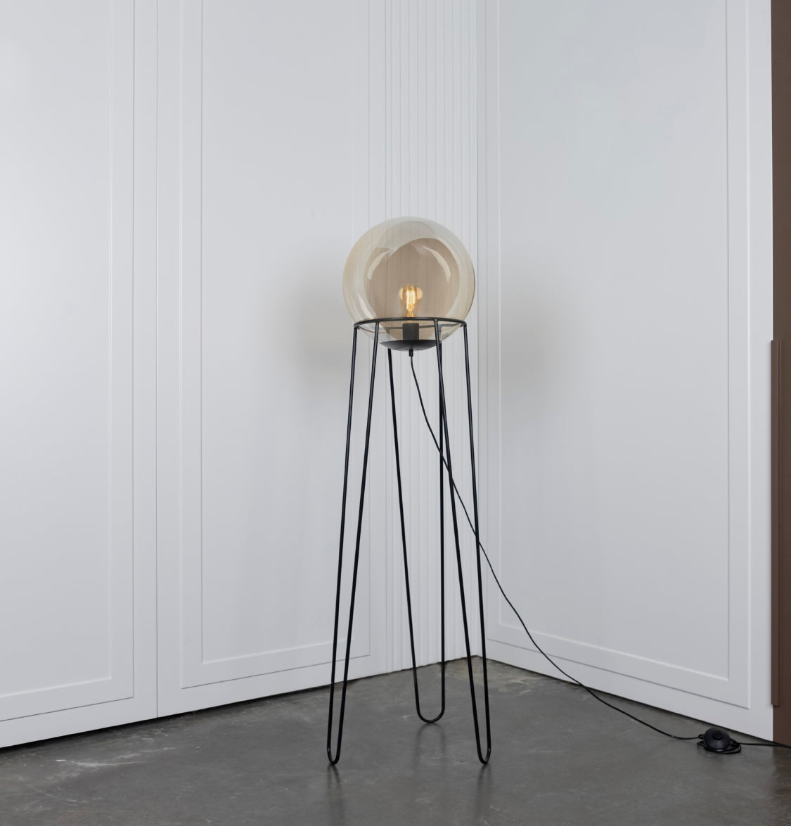 Karatay Lambader, siyah metal gövdesiyle güçlü bir duruş sergilerken cam detaylarıyla dekorasyona zarif bir ışık oyunları katar. Modern ve endüstriyel mekânlarda dikkat çeken bir parçadır.