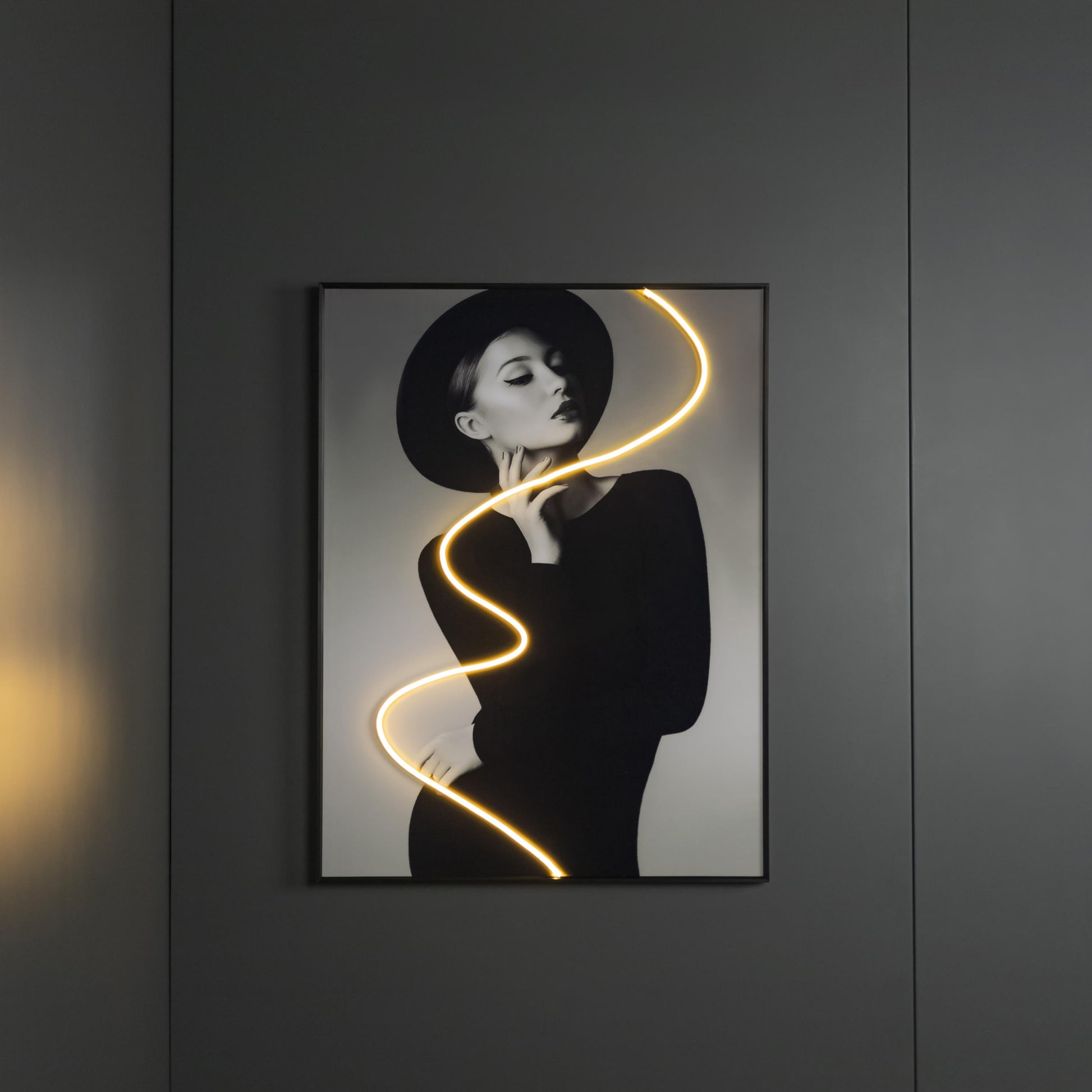 Nora Tablo, modern ve zarif tasarımıyla yaşam alanlarına sanatsal bir dokunuş katıyor. Minimalist siyah-beyaz portre üzerine entegre edilmiş sıcak tonlu LED ışık şeridi, hem tabloyu hem de bulunduğu ortamı farklı bir ambiyansa büründürüyor. Gün ışığı efektiyle öne çıkan bu aydınlatma detayı, gece ve gündüz farklı atmosferler oluşturmanıza imkân tanır. Duvar dekorasyonunuza hem estetik hem de işlevsel bir özellik ekler.