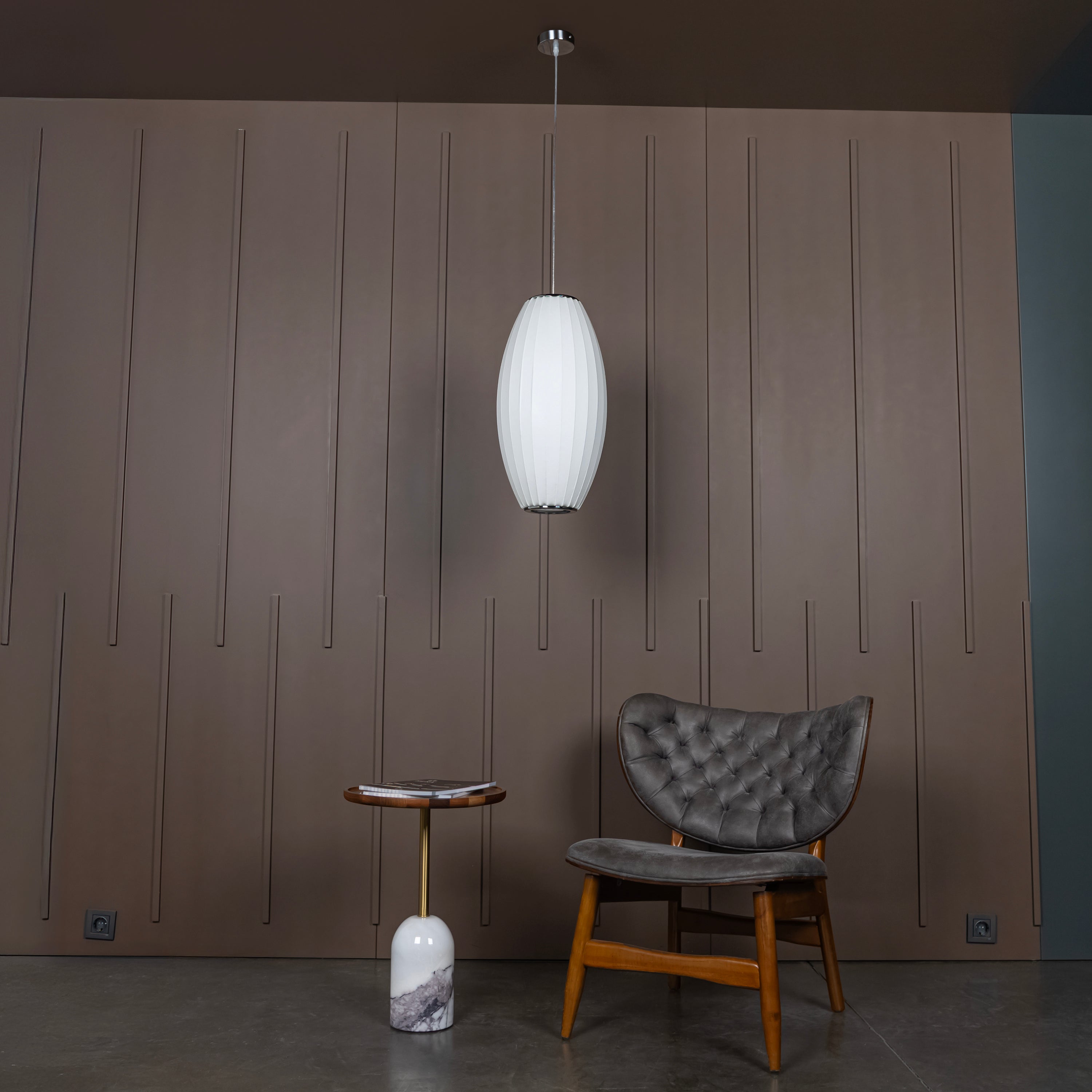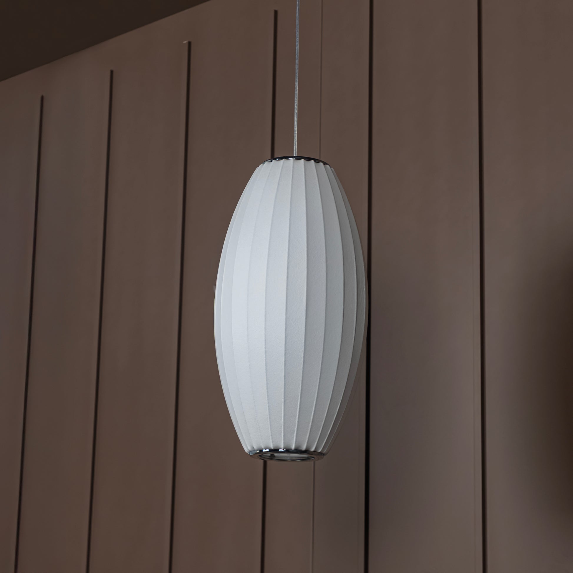 Orion Sarkıt Avize, beyaz polimerin temiz görünümünü mat krom detaylarla şık bir hâle getirir. Silindirik formu, ışığın ortamda dengeli yayılmasını sağlar.