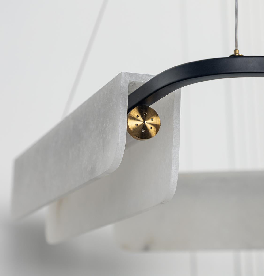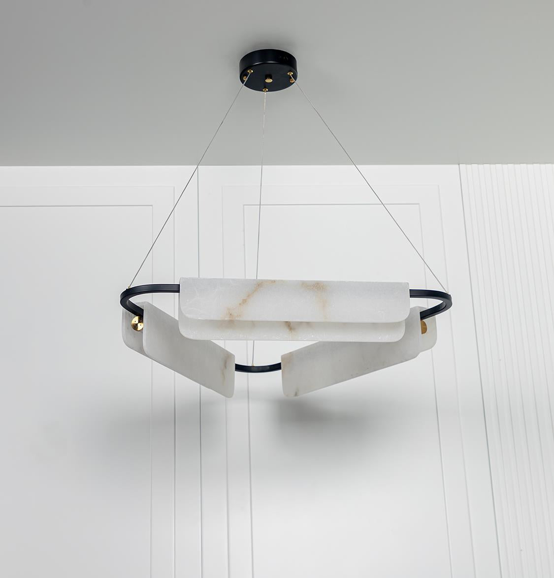 Orkos 3'lü Avize, eskitme metal gövdesi ve beyaz mermer panelleriyle modern lüksü mekâna taşır. Katmanlı formu, geniş alanlarda dengeli bir vurgu yaratırken göz yormayan zarif bir ritim oluşturur.
