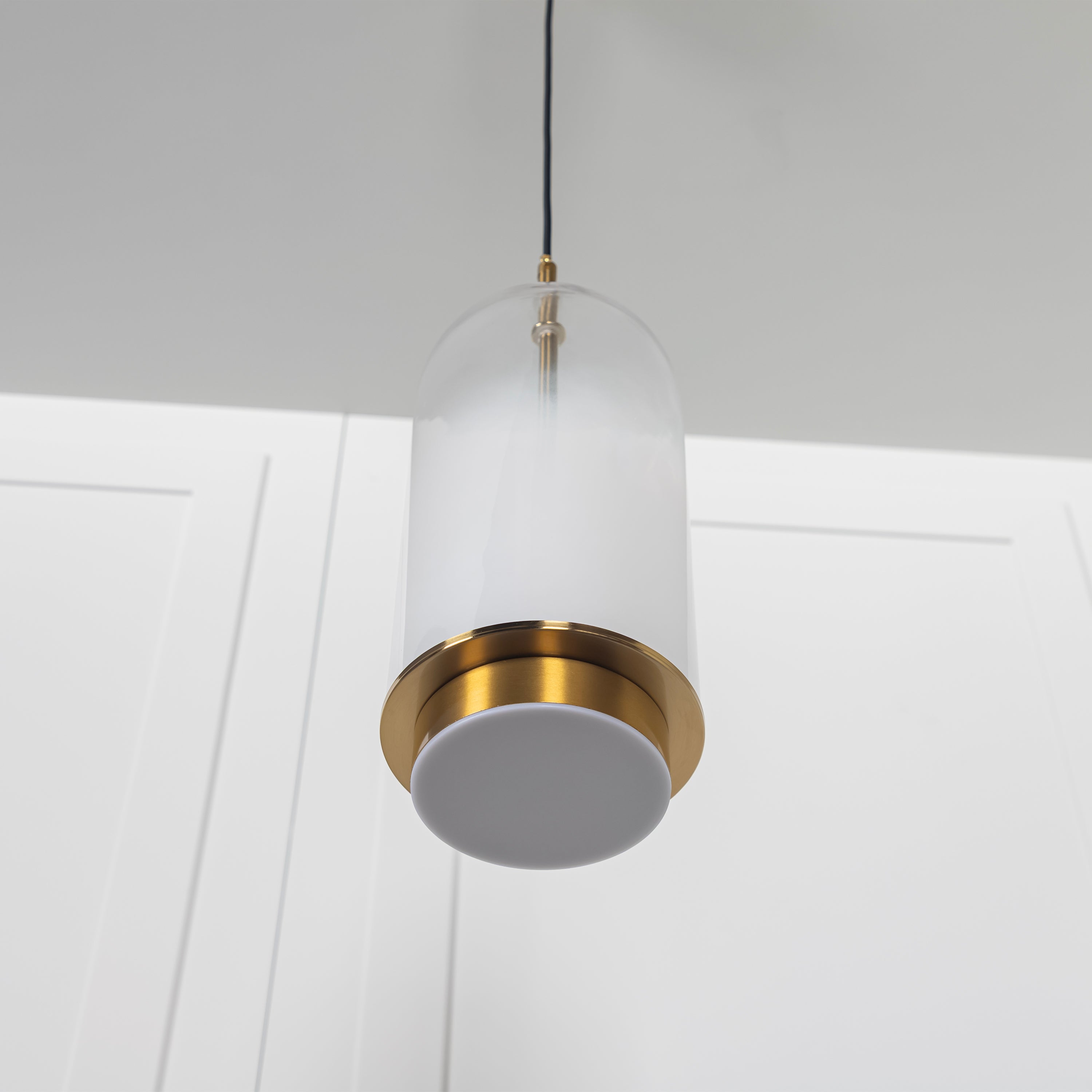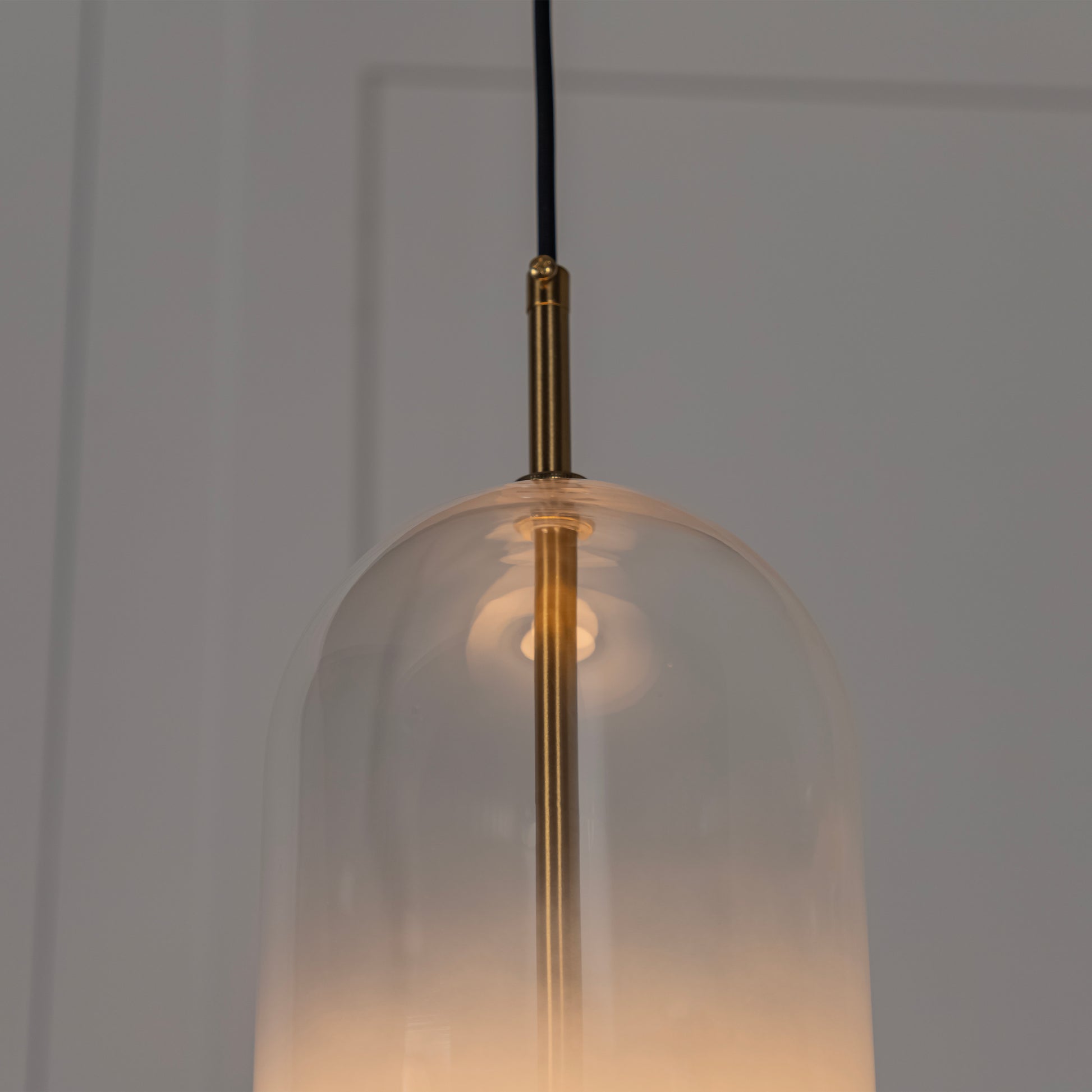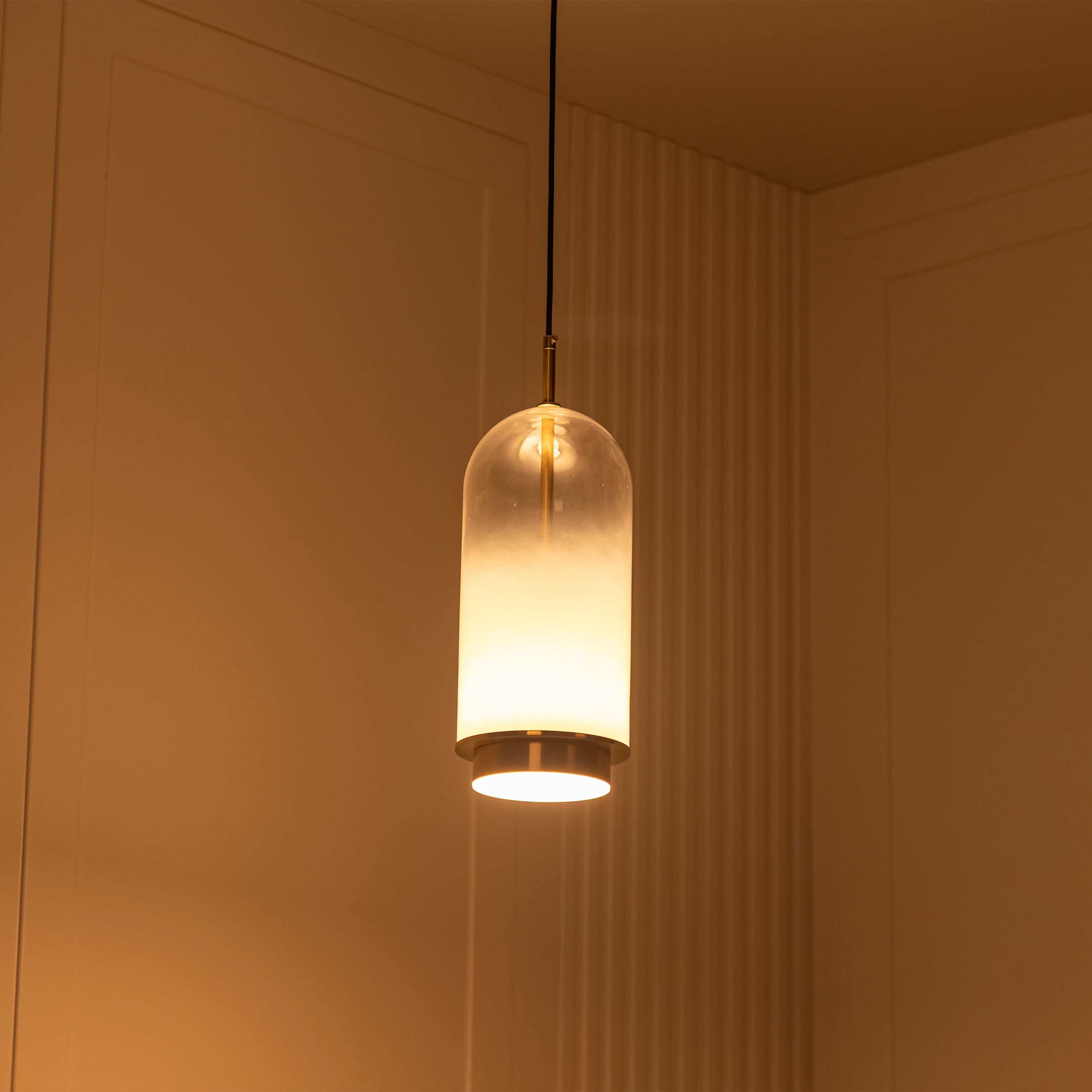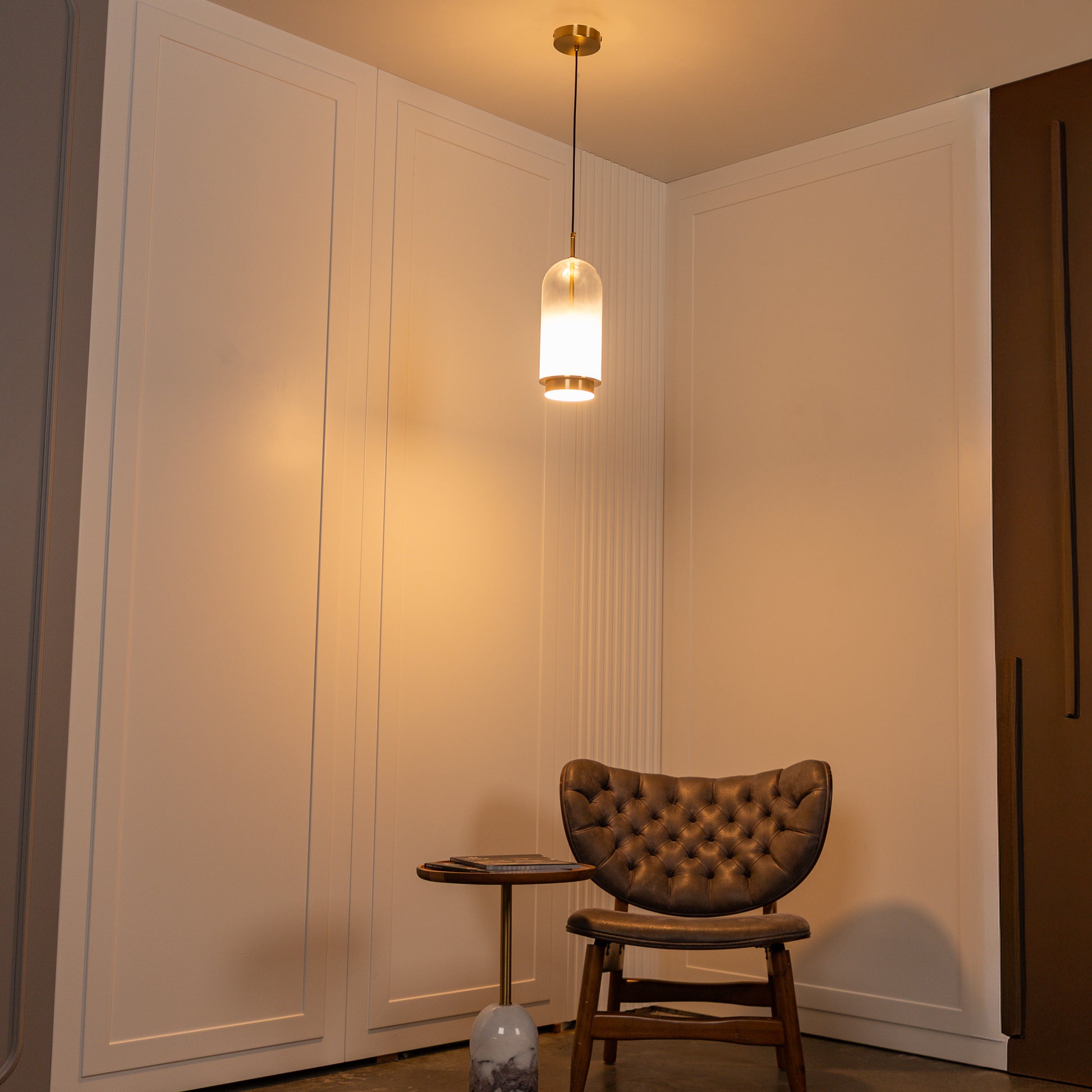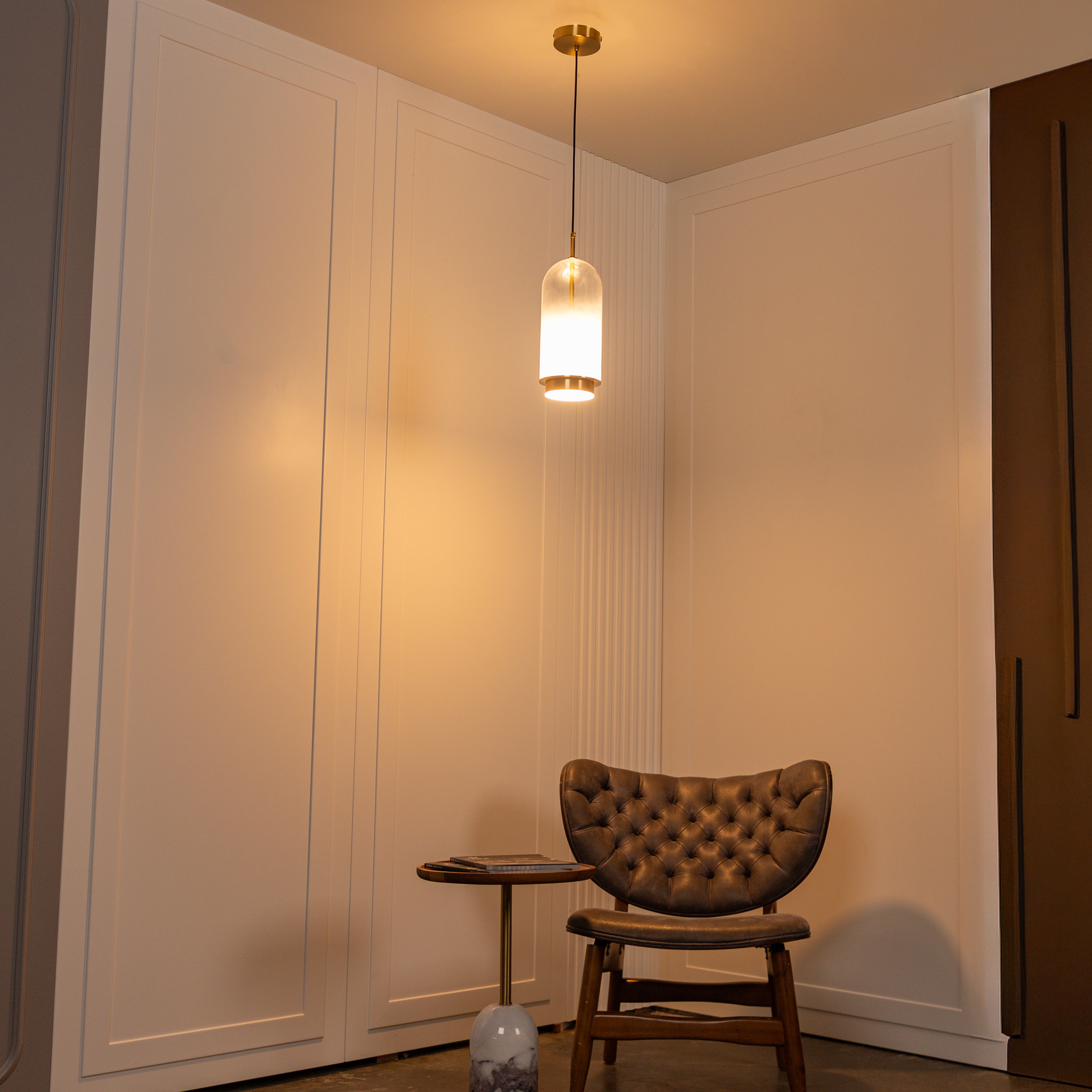 Beyaz geçişli cam formu sayesinde homojen bir ışık dağılımı sağlanır; oturma köşelerinde, yemek masalarında ya da antrelerde sade ama dikkat çekici bir etki yaratır. Tek başına kullanıldığında minimal bir vurguyken, grup olarak kullanıldığında dekoratif bir ritim oluşturur.