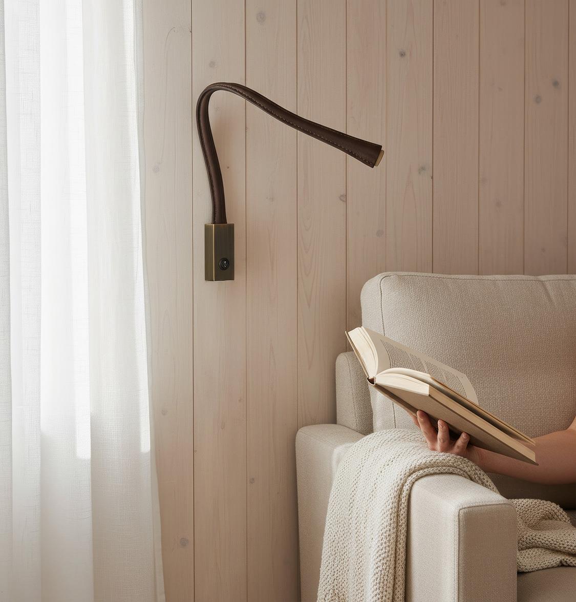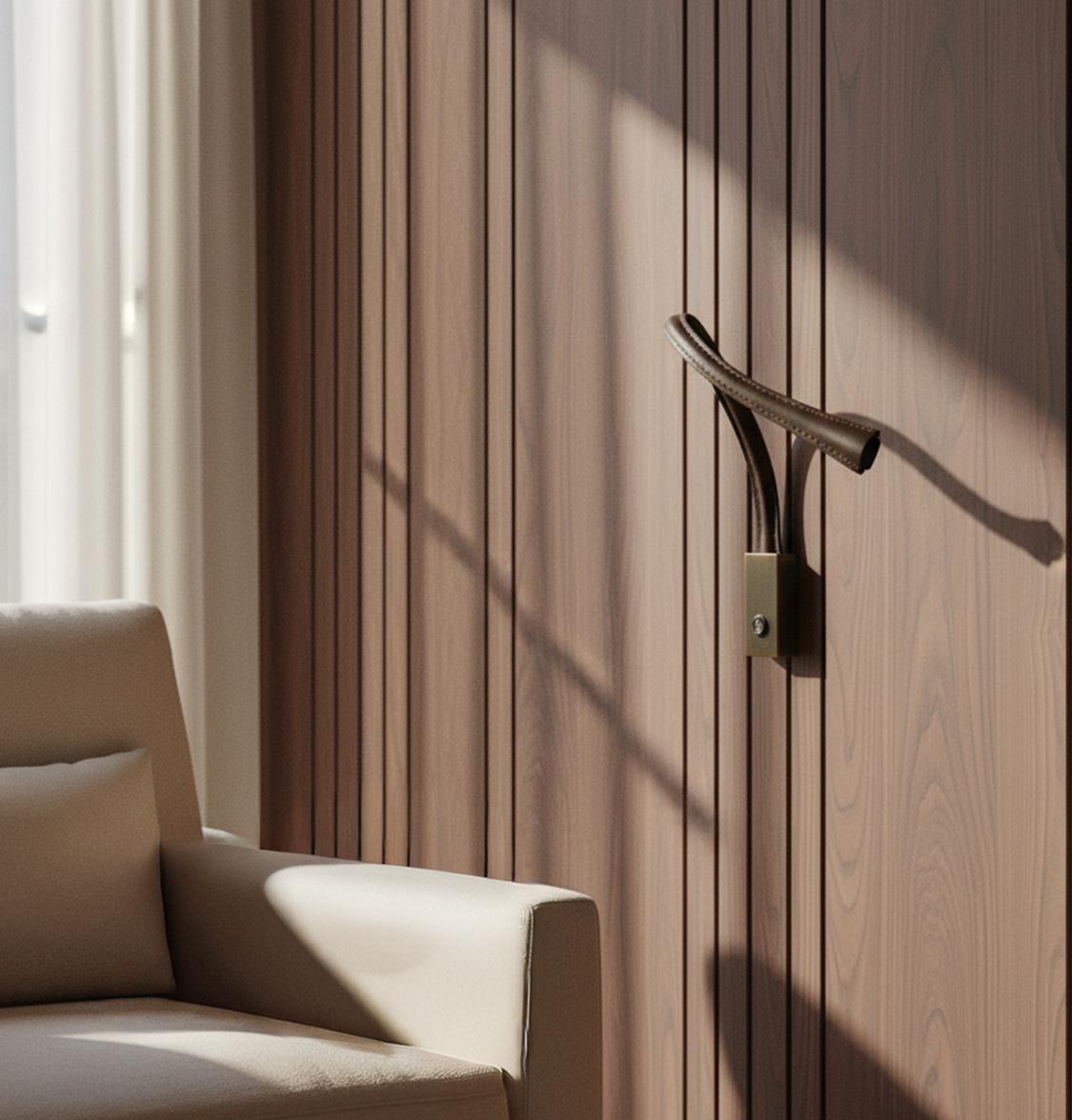 Sambro Aplik, sıcak tonları ve modern çizgisiyle yaşam alanlarına sakin ve rafine bir atmosfer kazandırmak için tasarlandı. Kahverengi deri yüzeyinin doğal dokusu, eskitme metal detaylarla birleşerek son derece zarif ve çağdaş bir görünüm oluşturur. İnce ve akıcı formu, duvarda minimal bir iz bırakırken aynı zamanda güçlü bir karakter sunar.