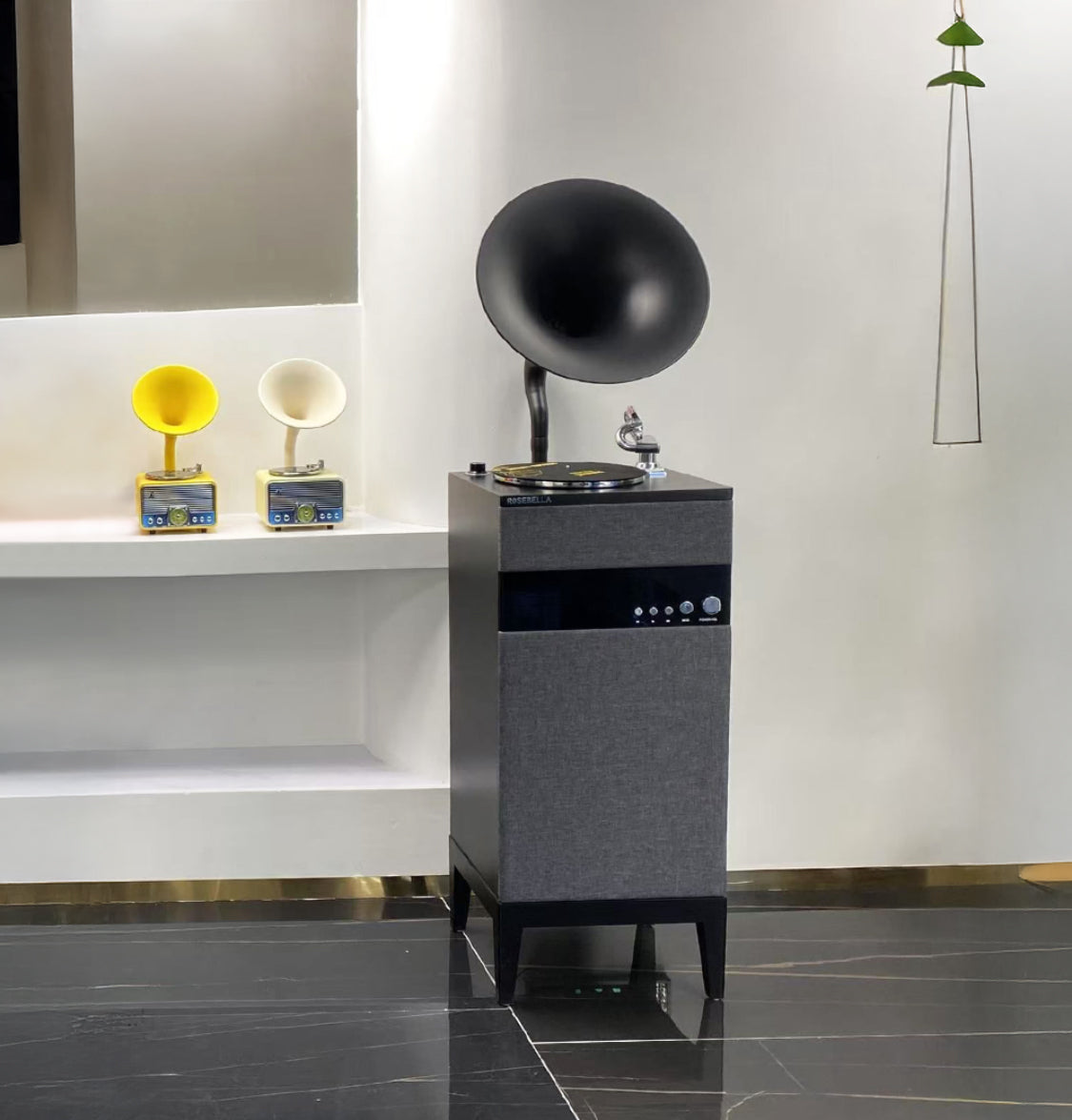 Gramofon Müzik Çalar, modern yaşam alanlarına nostaljik bir dokunuş katarak geçmişin büyüsünü günümüz estetiğiyle buluşturur. Siyah alüminyum gövdesi ve gri ahşap tabanı, mekâna hem sofistike bir görünüm hem de güçlü bir duruş kazandırır.