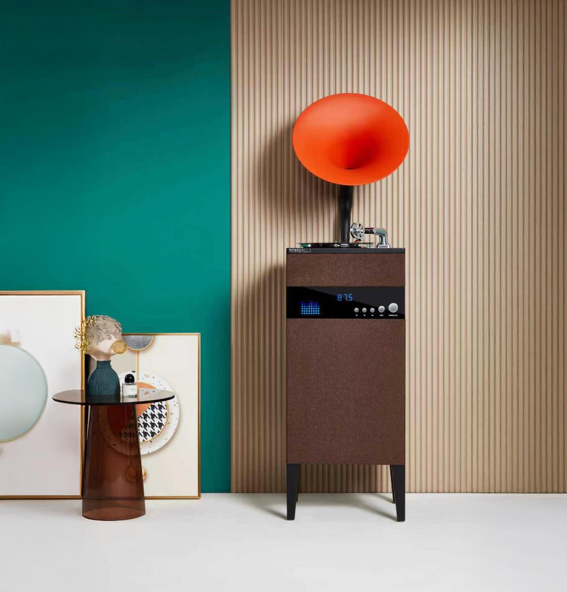 Turuncu Kahverengi Gramofon; Salon dekorasyonu, müziksever koleksiyonları ya da vintage temalı alanlar için çarpıcı bir tercihtir.