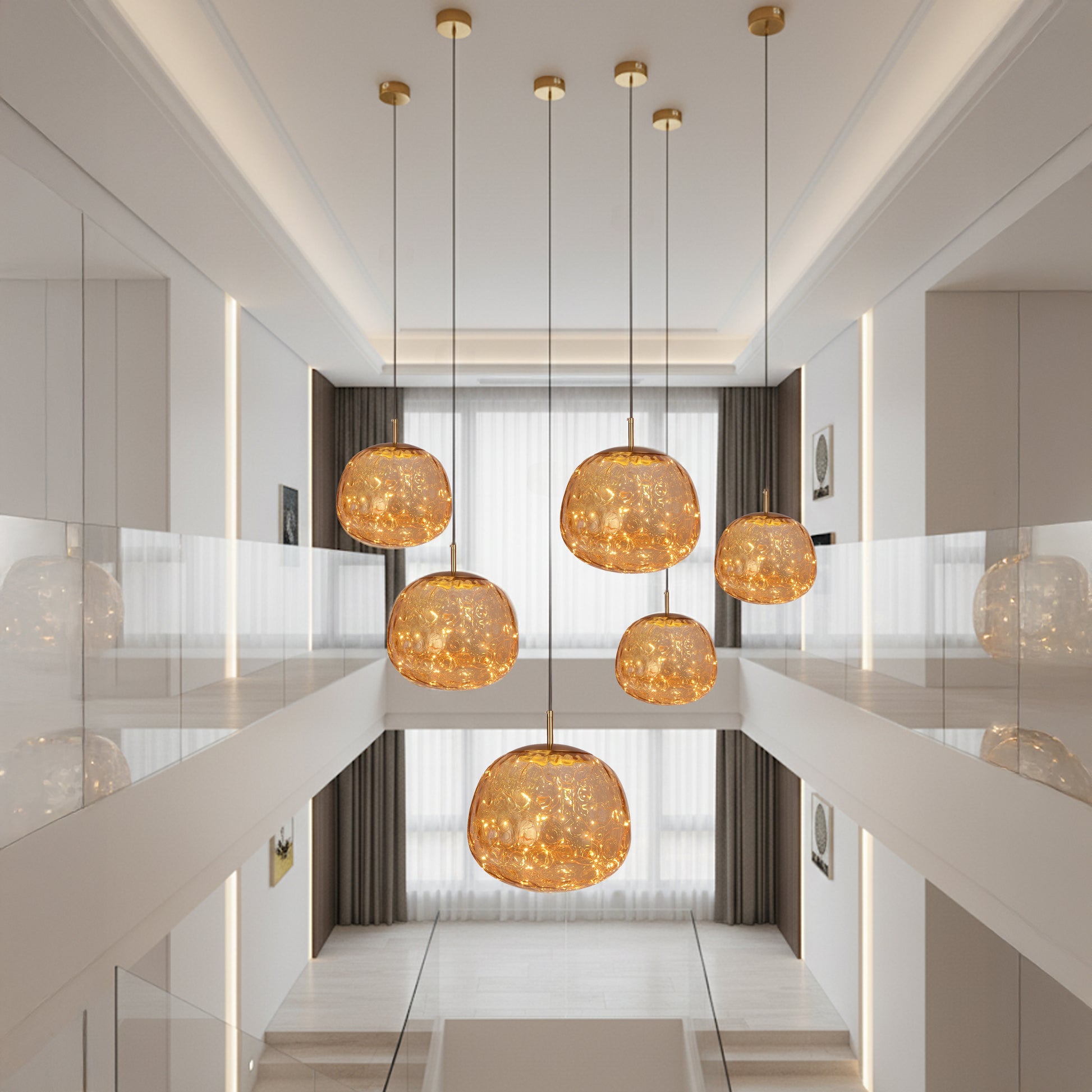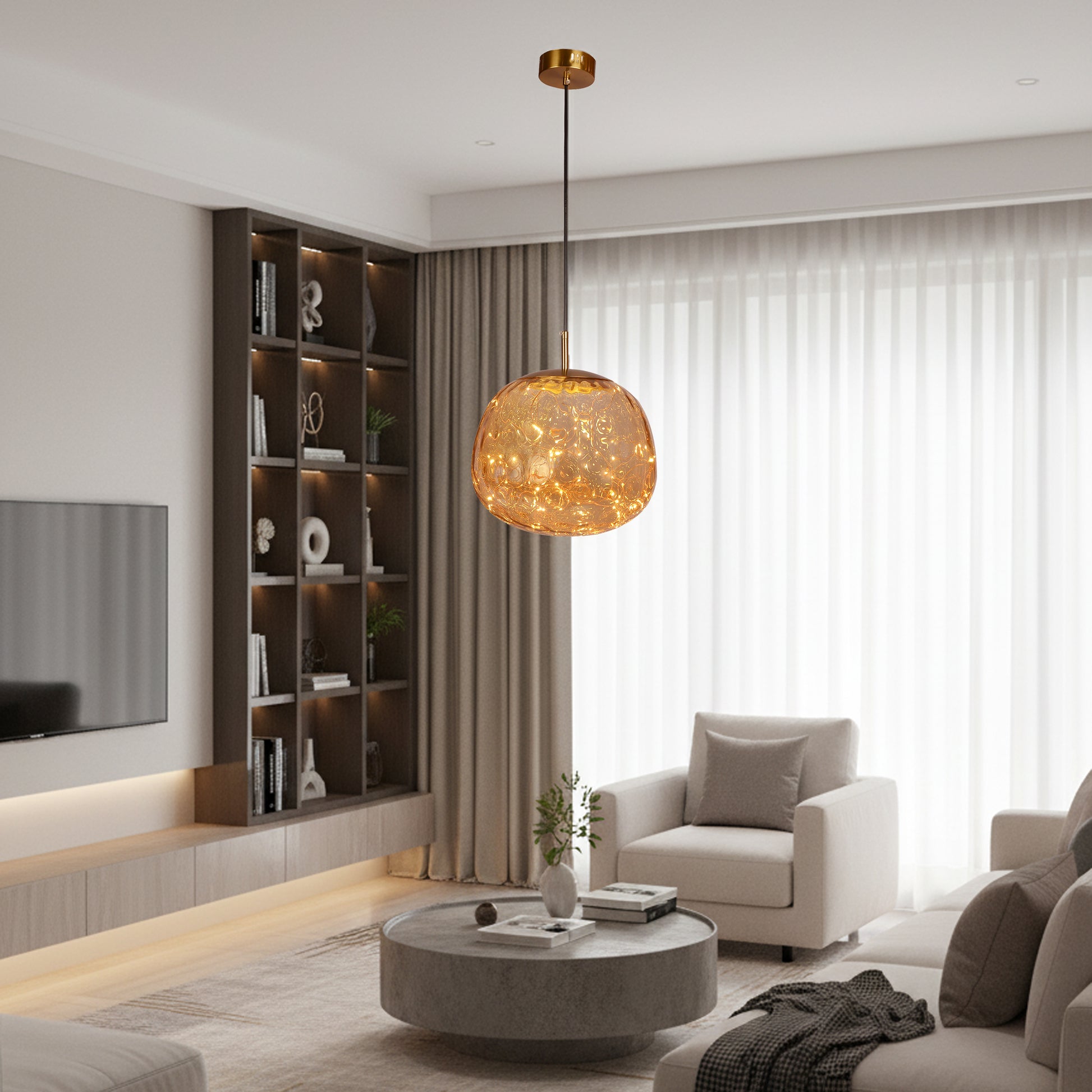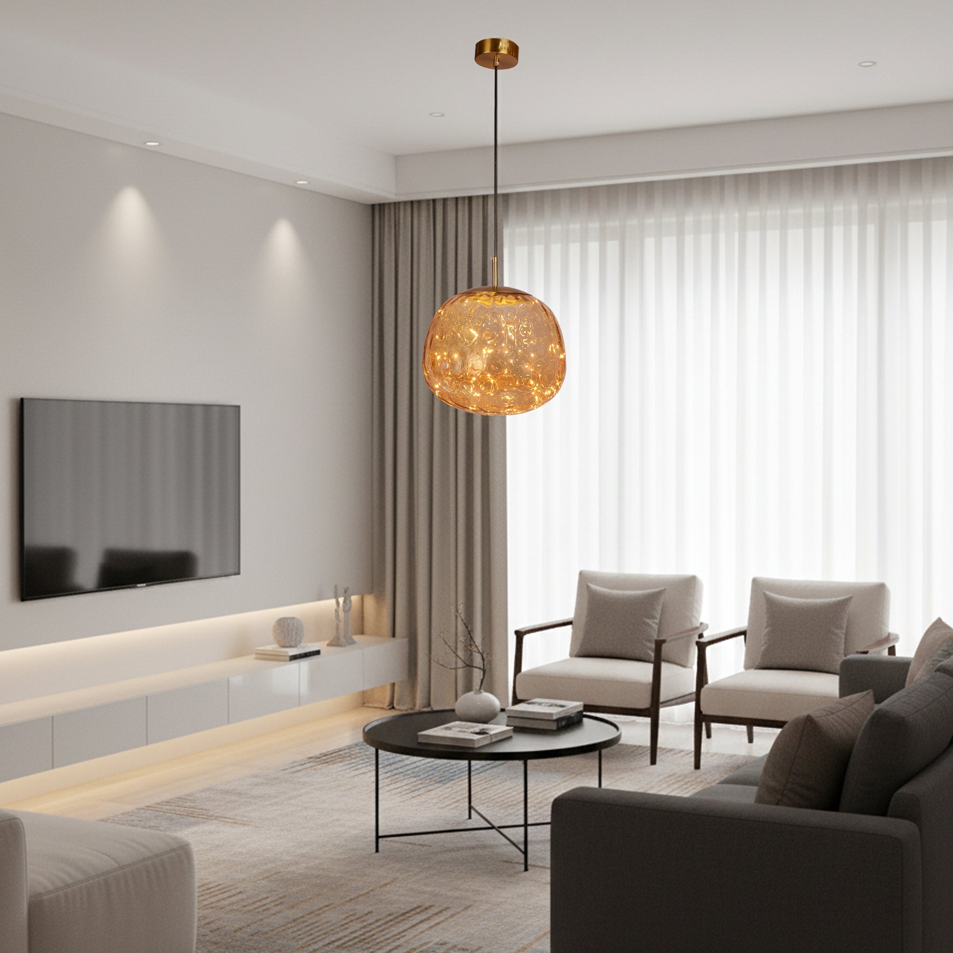Viyana Göktaşı Sarkıt, bal rengindeki cam küresiyle sıcak ve yumuşak bir ışık yayarken, eskitme metal detaylarıyla nostaljik bir şıklık sunar. Göktaşı formu, doğal ve sofistike bir etki yaratır.